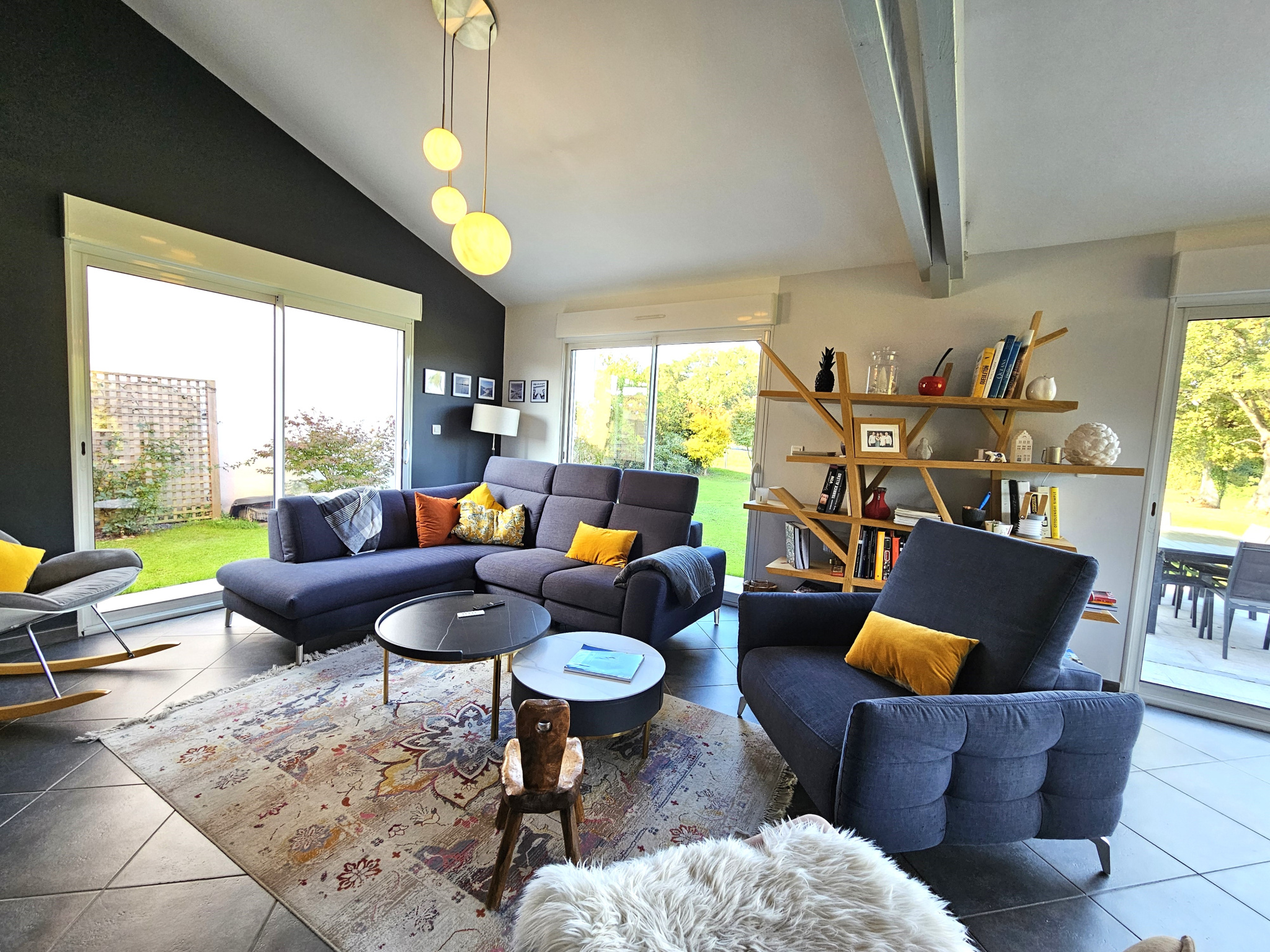 Vue imprenable pour cette très belle contemporaine prenant la lumière de toute part. Le rez de chaussée vous offre une magnifique pièce de vie assortie d'un poêle à bois, une cuisine semi-ouverte, une chambre avec salle d'eau et dressing, un bureau. L'étage est partagé par 4 belles chambres et une salle de bains.