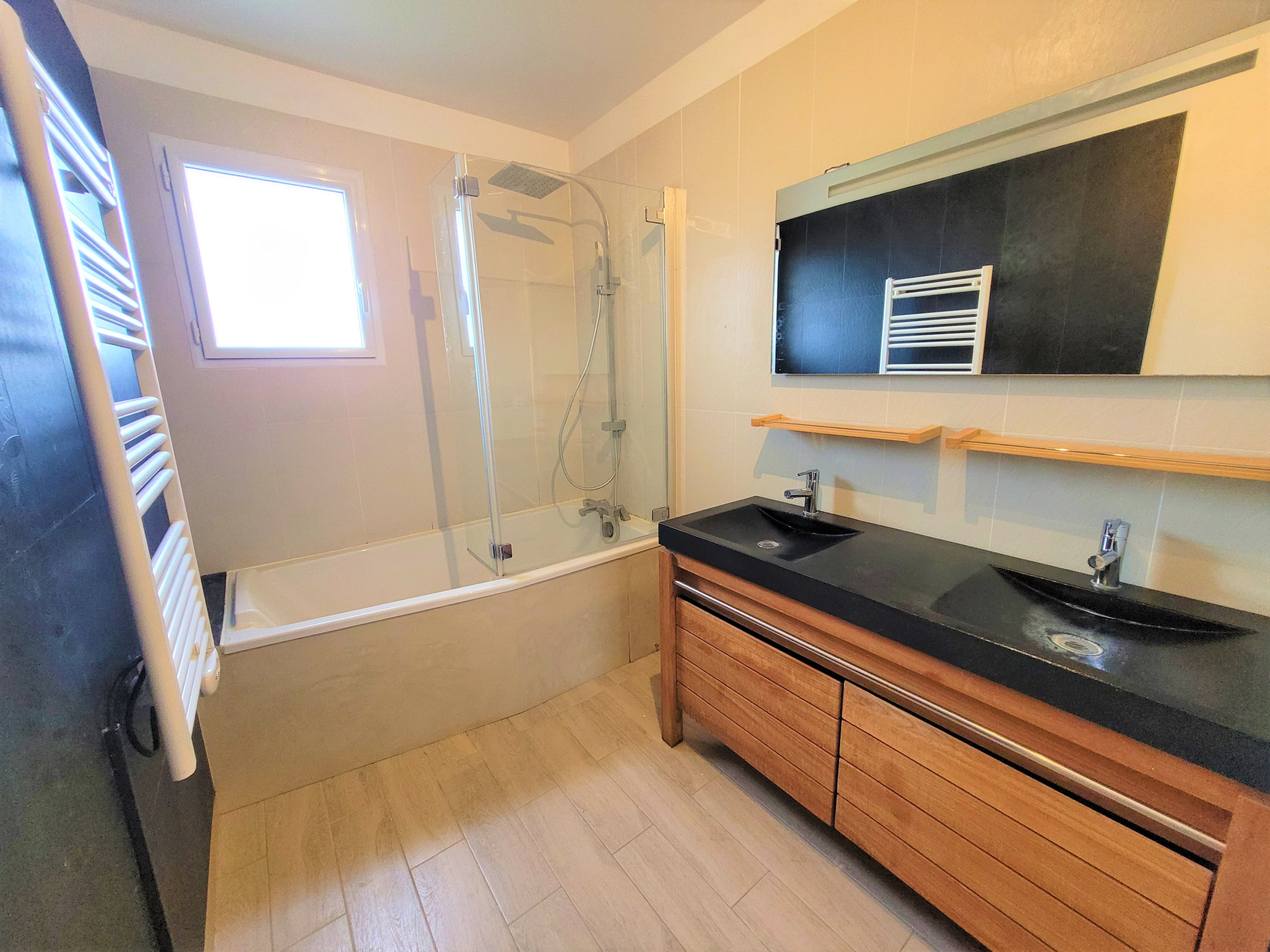 Une belle salle de bain avec une baignoire/douche sur mesure, double vasque, wc.