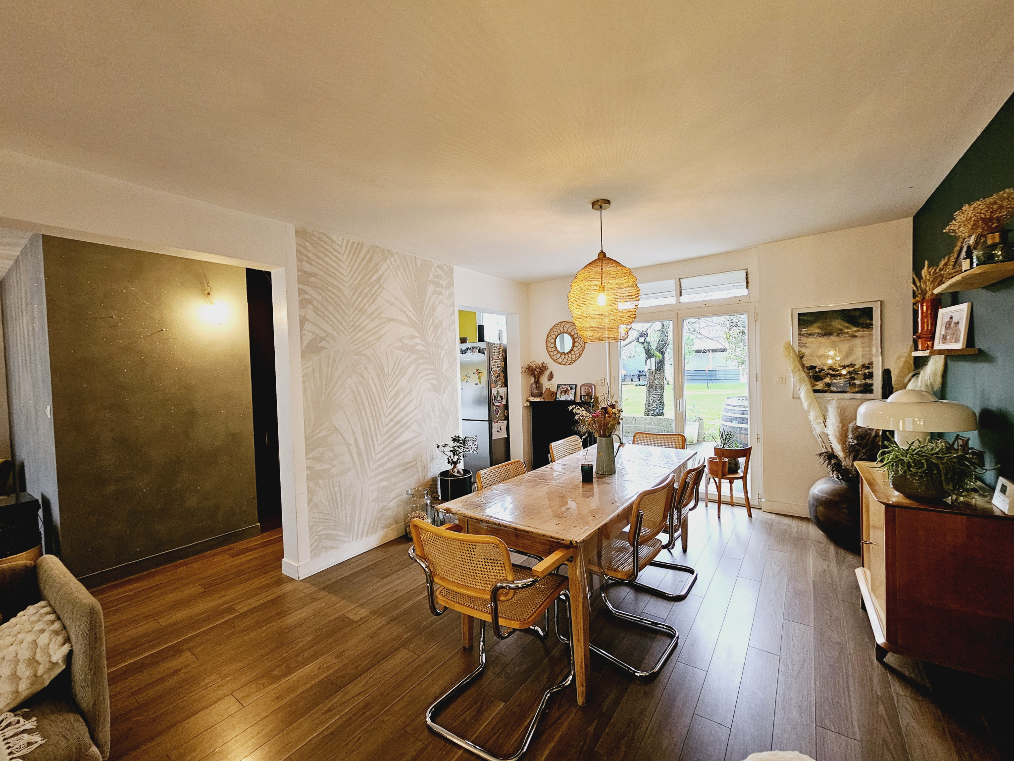 Le rez de chaussée est partagé par un double séjour très cosy une cuisine aménagée et équipée, un bureau/salle de jeux, un WC. L'étage distribue 3 belles chambres sur parquet et une salle d'eau avec WC. Garage attenant et joli jardin plein Sud avec deux dépendances. Grand grenier pour compléter le tout.