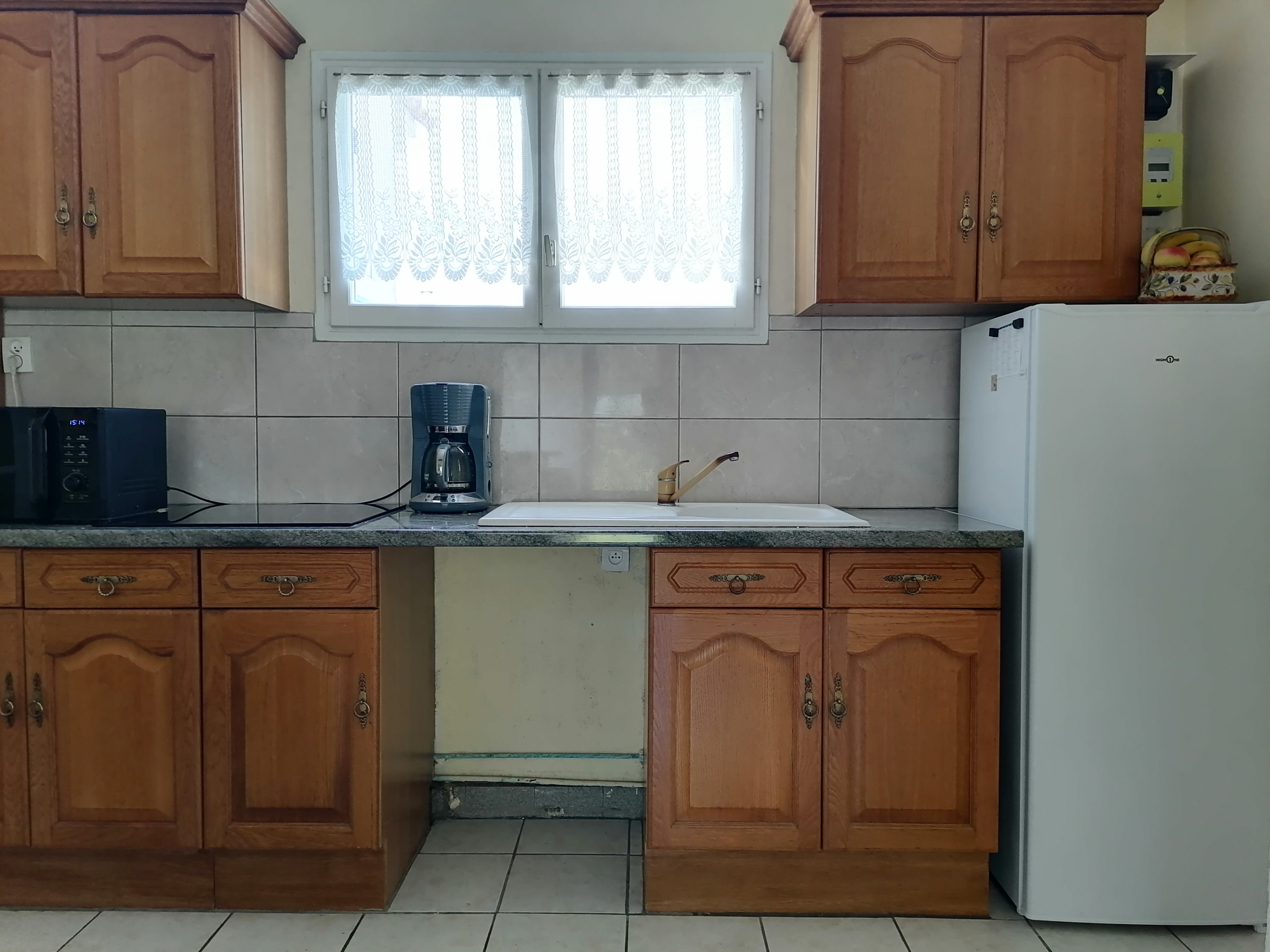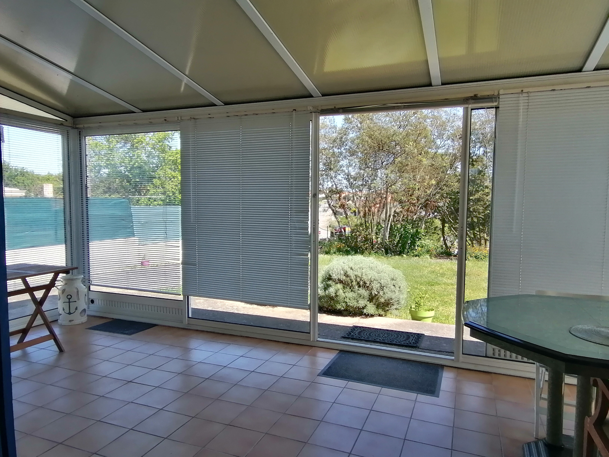 Cette maison d'environ 90m² au sol comprend au rez de chaussée : Une entrée avec placard. Un salon/séjour avec cuisine aménagée et équipée (four, plaque élec) dont l'ensemble mesure environ 26m² et donne sur une véranda d'environ 17m² exposée Est. Une chambre d'environ 12.5m². Une chambre d'environ 9.5m². Une salle d'eau d'environ 5.5m². Un WC. A l'étage : Une mezzanine avec de nombreux rangements d'environ 15m² au sol.