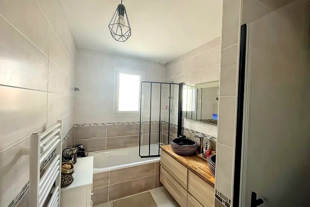 Côté nuit, un couloir dessert 3 chambres avec placards, une salle de bain ( avec sa douche et sa baignoire) ainsi qu'un WC séparé.