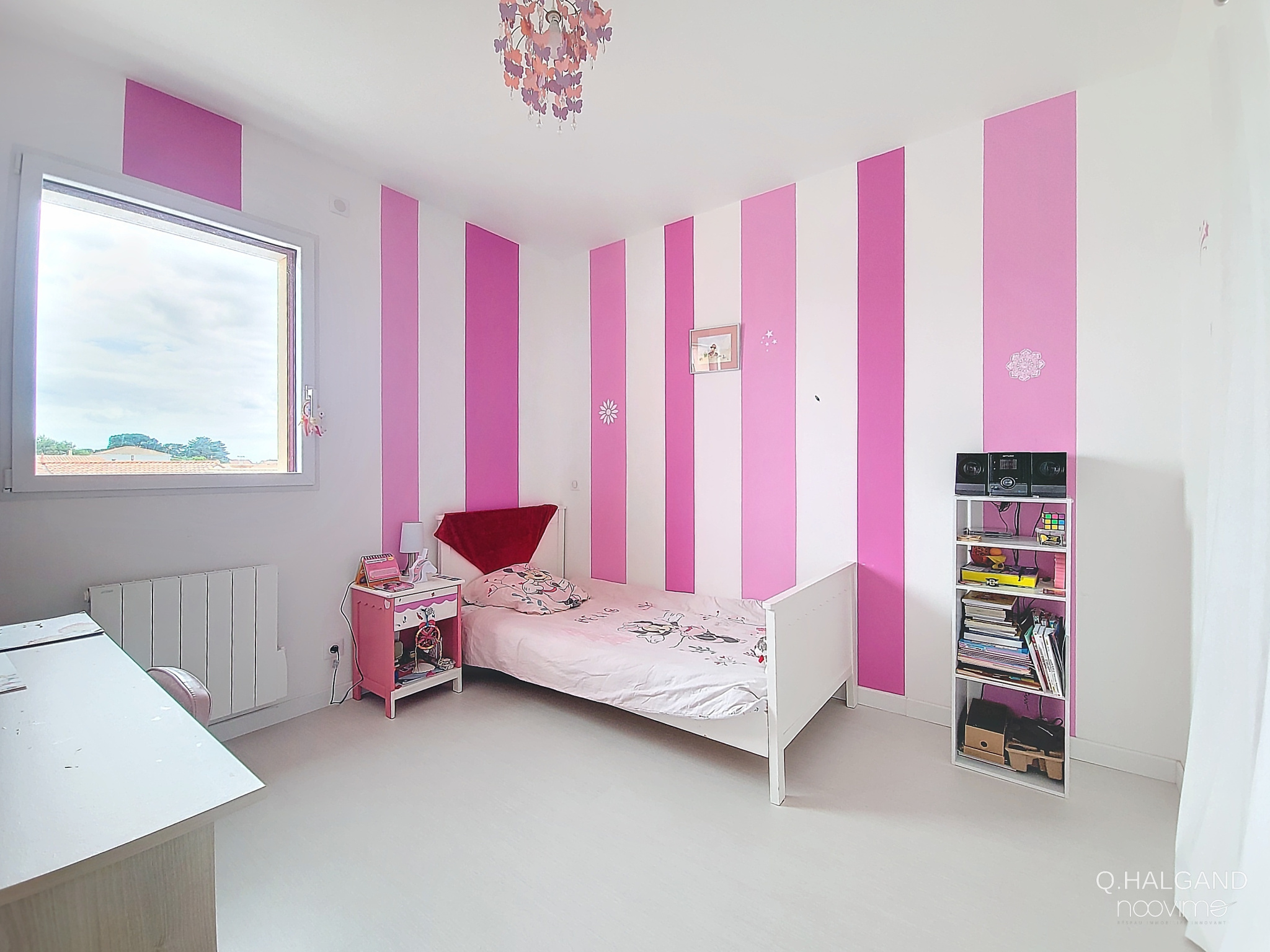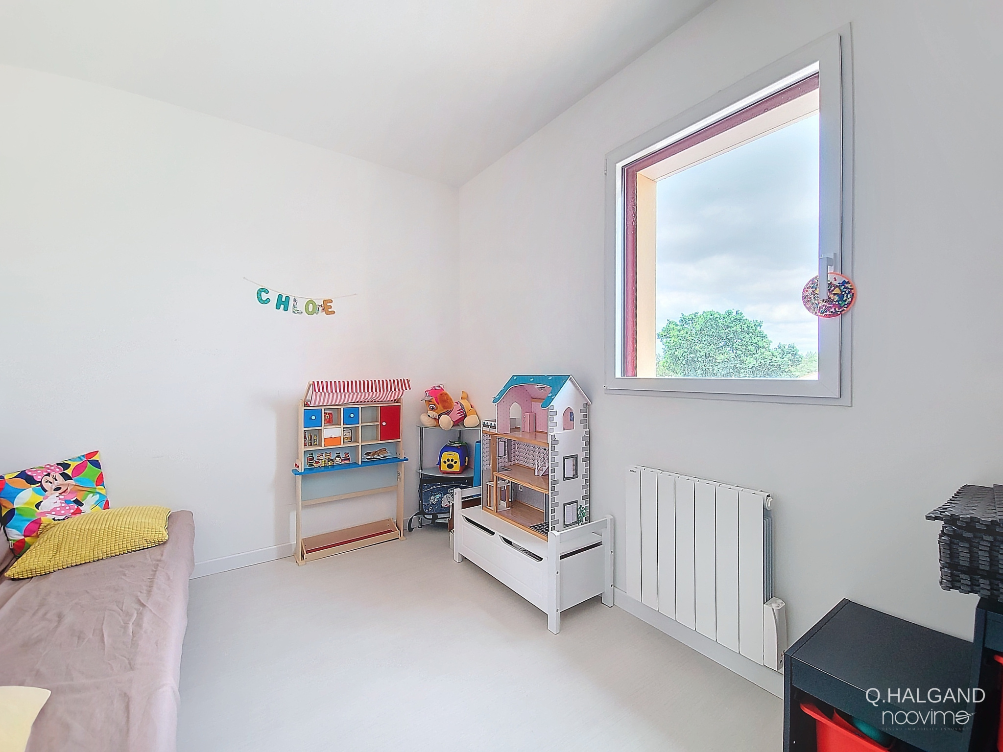 À l’étage, trois chambres d'environ 10 m² avec placards offrent tout le confort nécessaire. Une salle de bain avec une baignoire en angle, un WC suspendu et un sèche-serviettes répondent aux besoins de toute la famille. Le chauffage est assuré par un poêle à pellets au rez-de-chaussée, un chauffage par le sol dans la suite parentale, des radiateurs électriques dans les chambres à l’étage et une climatisation réversible pour un confort optimal.