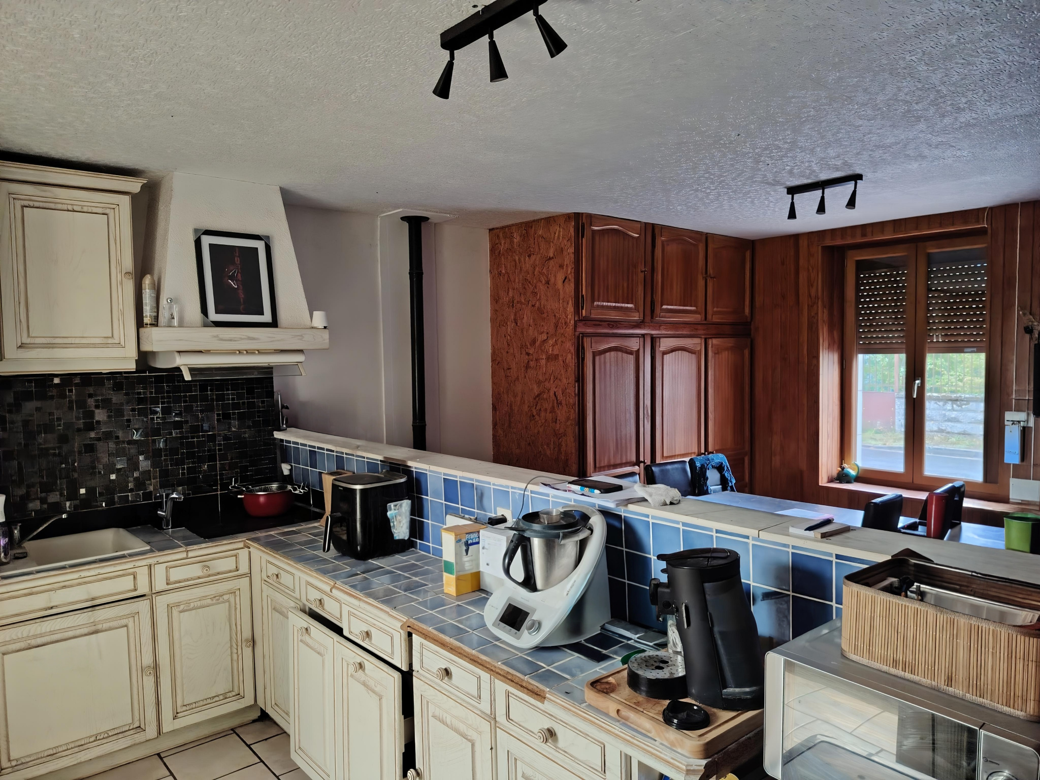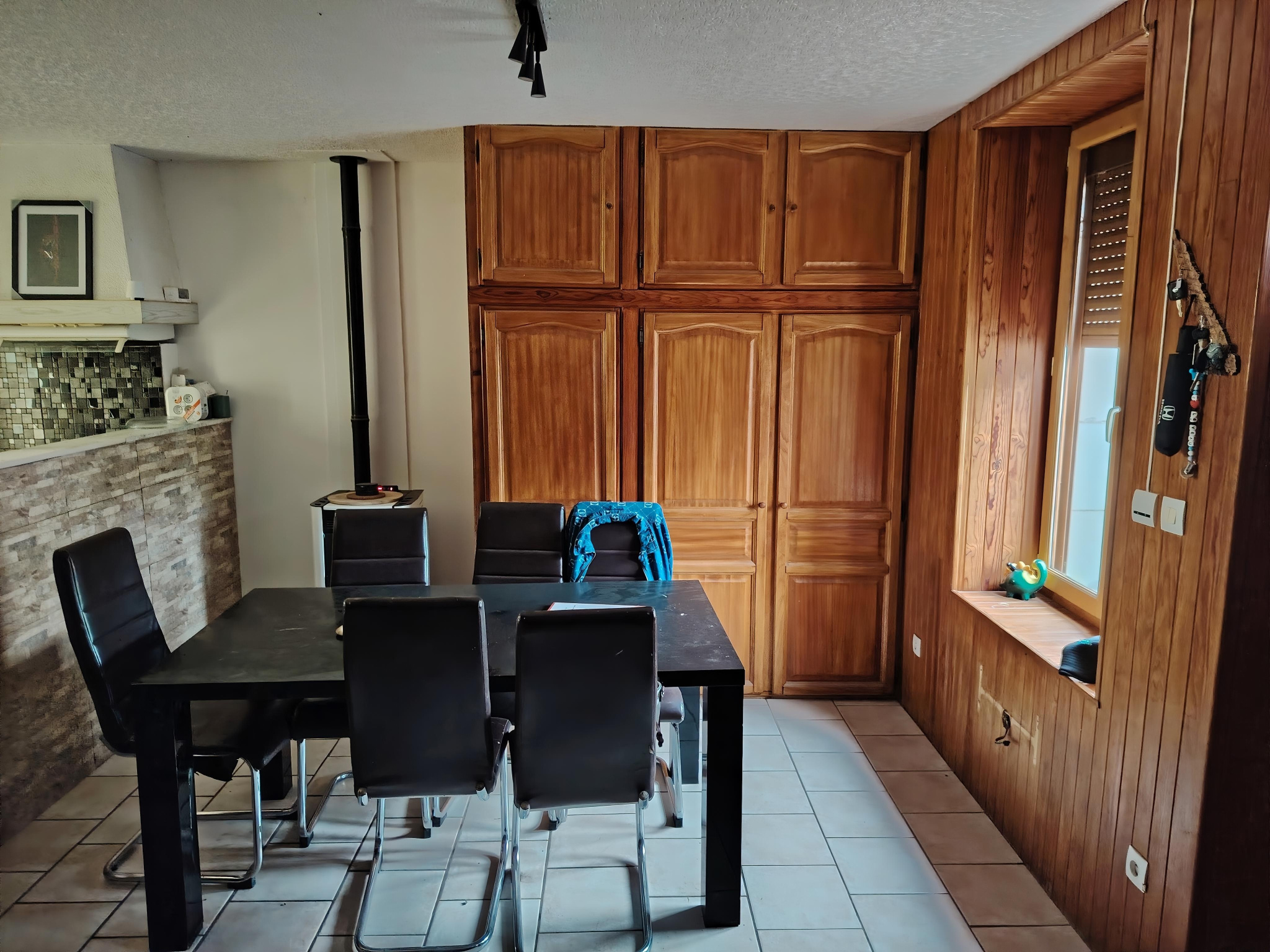 Dès l’entrée, vous profitez d’un salon-séjour lumineux de 24 m² avec poêle à granulés, ouvert sur une cuisine conviviale. Le confort est assuré par le double vitrage et les volets roulants électriques.