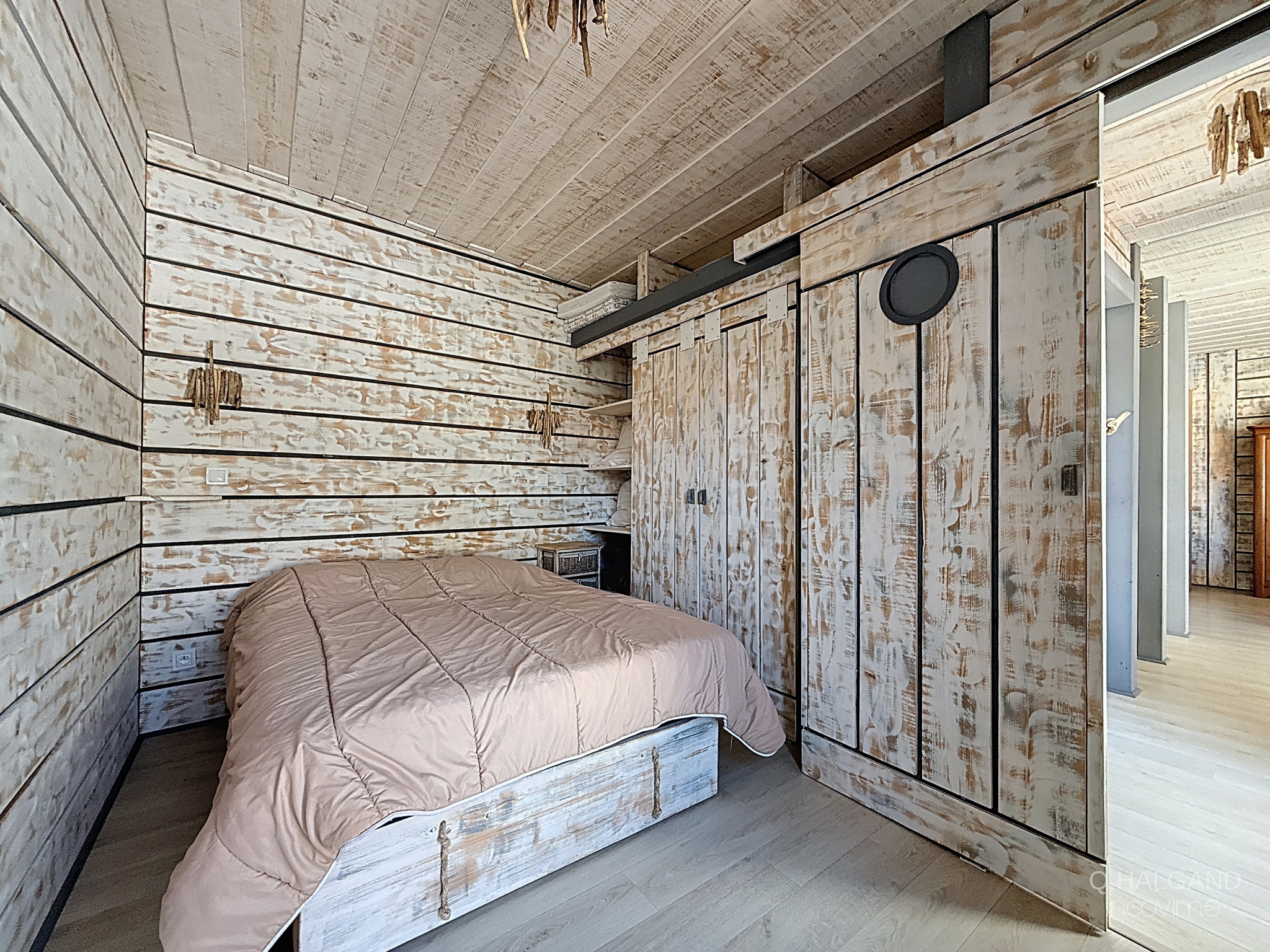 La première maison propose une grande pièce de vie traversante et lumineuse d’environ 40 m², intégrant cuisine ouverte, salon et séjour, chauffée par un poêle à bois. Le rez-de-chaussée dispose également d’une chambre avec dressing (environ 12 m²), d’une salle d’eau avec douche à l’italienne, d’un WC séparé, et d’une buanderie. À l’étage, une mezzanine d’environ 15 m² au sol avec rangements sous mansarde complète les volumes.