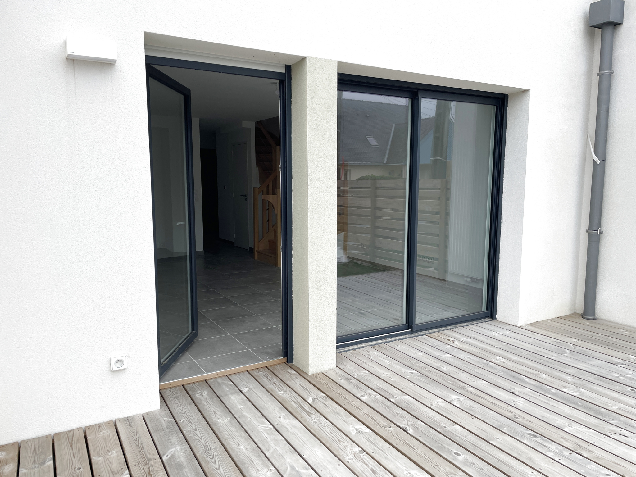 Spacieux et lumineux appartement en rez-de-chaussée s'apparentant à une maison individuelle, comprenant au RDC : une accueillante entrée avec placard, un grand séjour / salon / cuisine ouverte d'environ 27 m², une chambre avec placard, une salle d'eau avec WC. A l'étage : un palier desservant 2 belles chambres de 16 et 12 m² environ, avec placards aménagés, une salle de bains avec WC. Un petit jardin avec terrasse bois, une cave extérieure et une place de parking aérien complètent ce bien.
