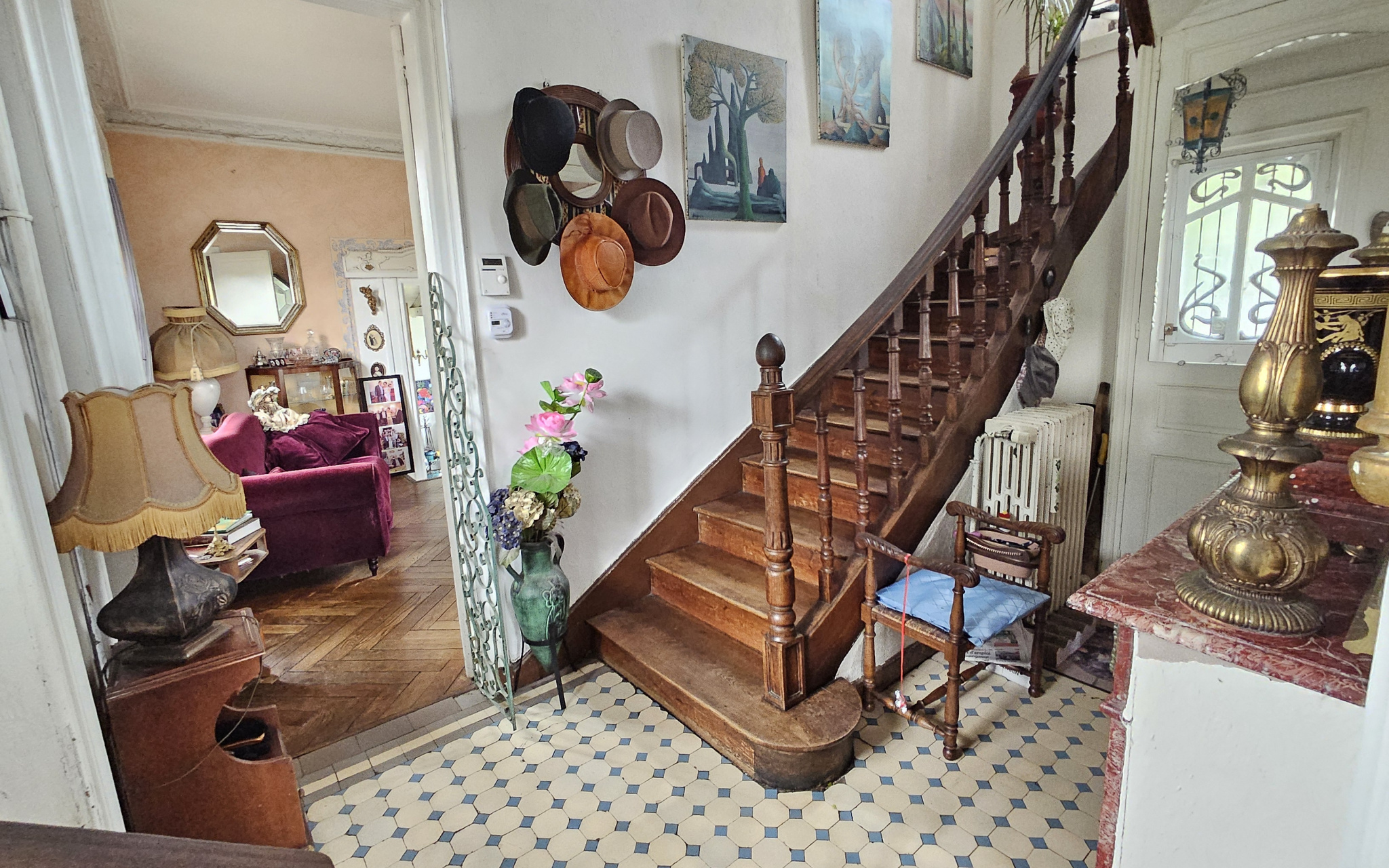 Dès l’entrée, on retrouve tout le charme d’une époque révolue : hauteurs sous plafond, moulures délicates, parquets anciens et lumière traversante composent une ambiance noble et intemporelle.