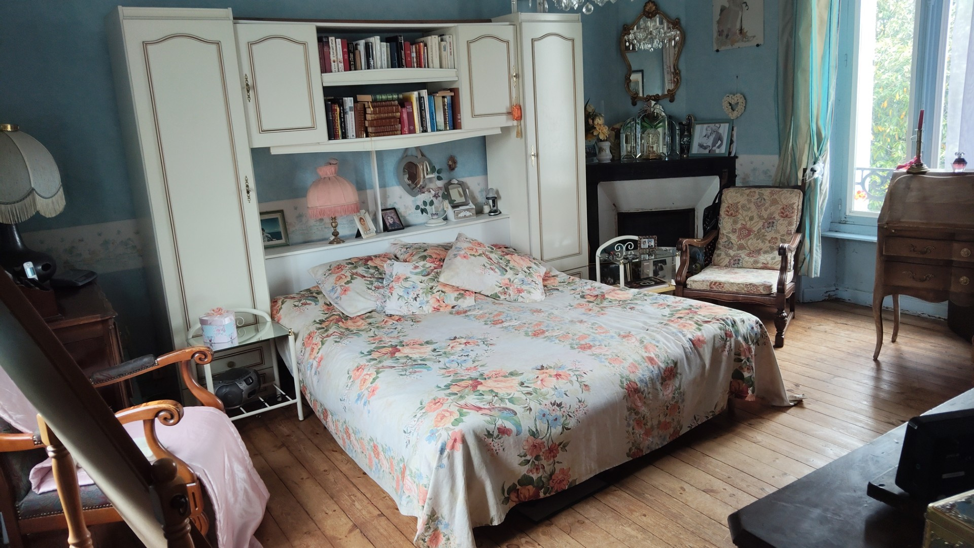 Aux étages, cinq chambres, dont une suite, se partagent deux salles de bains et un grenier aménagé en bibliothèque.