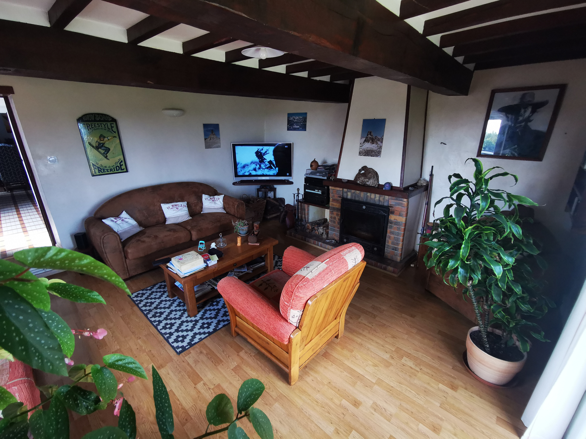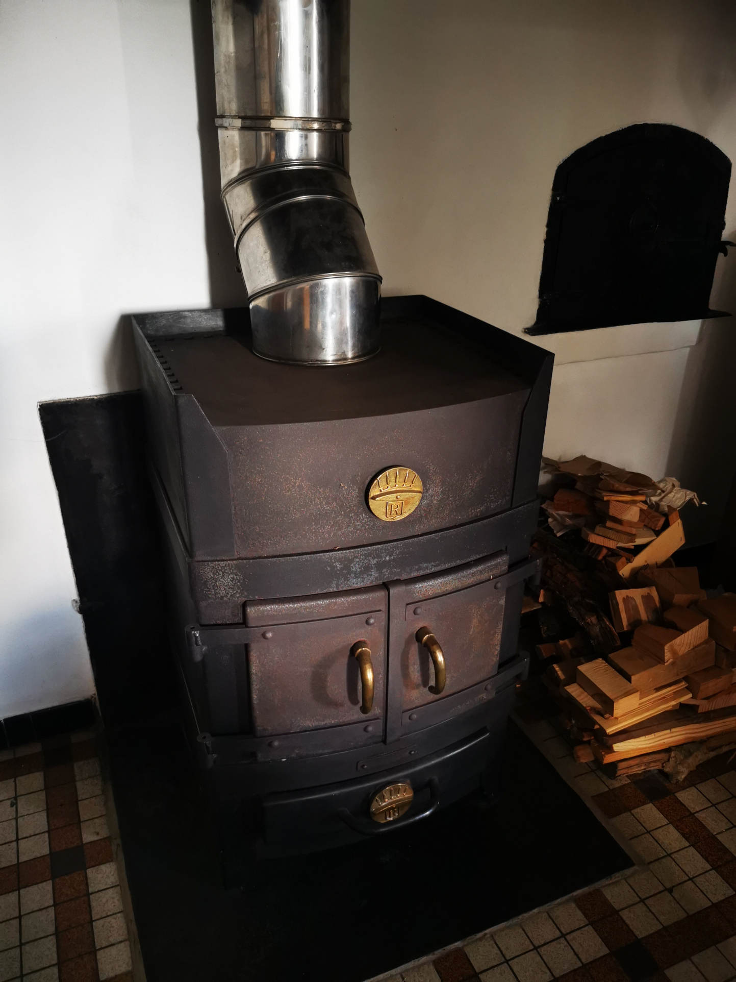 Vaste entrée desservant un salon cosy avec cheminée (foyer à cassette), une salle à manger avec poêle à bois ancien et fonctionnel en fonte, qui appelle au partage et à la convivialité.