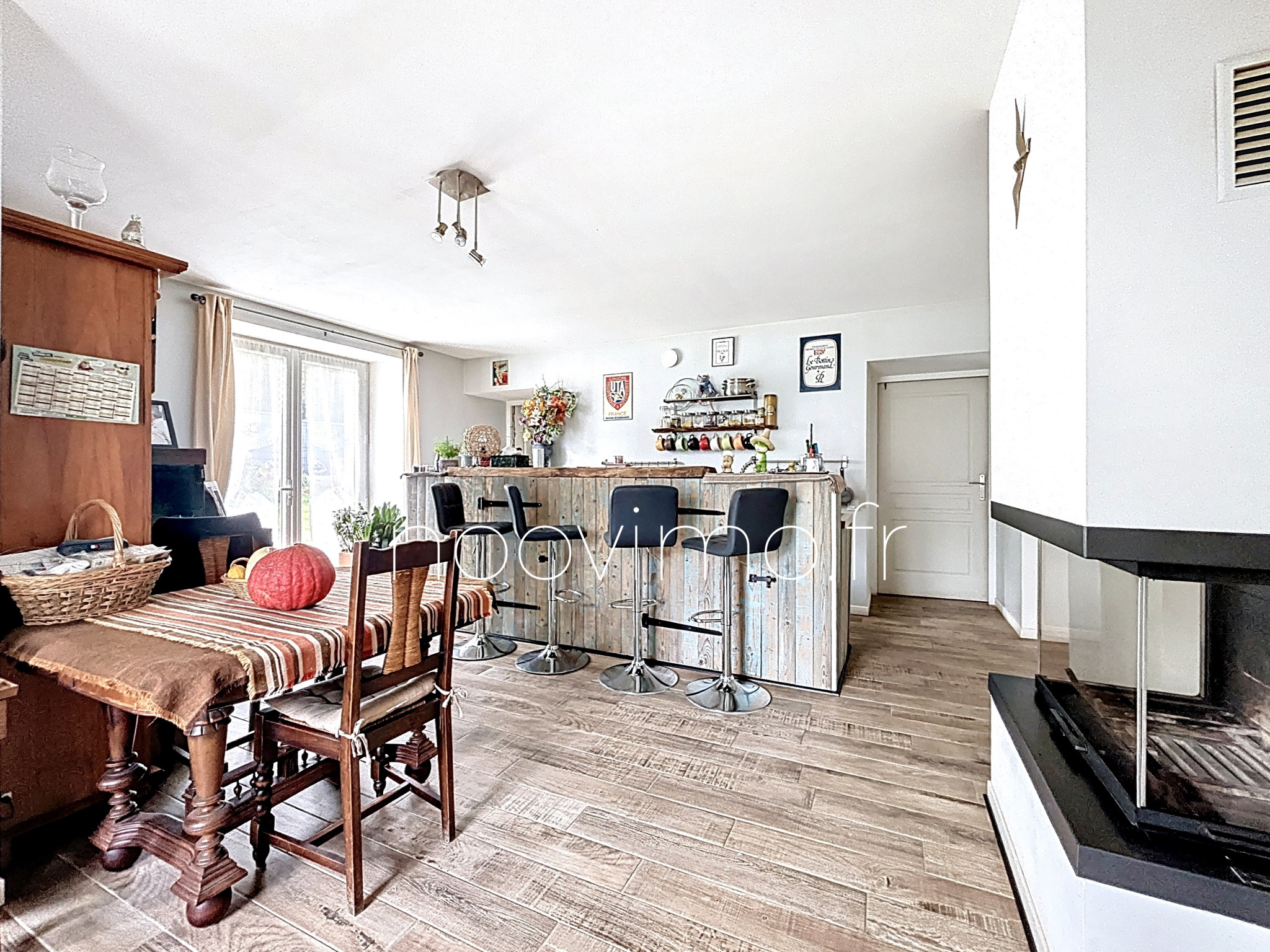 . Cuisine séparée avec espace repas et cheminée moderne