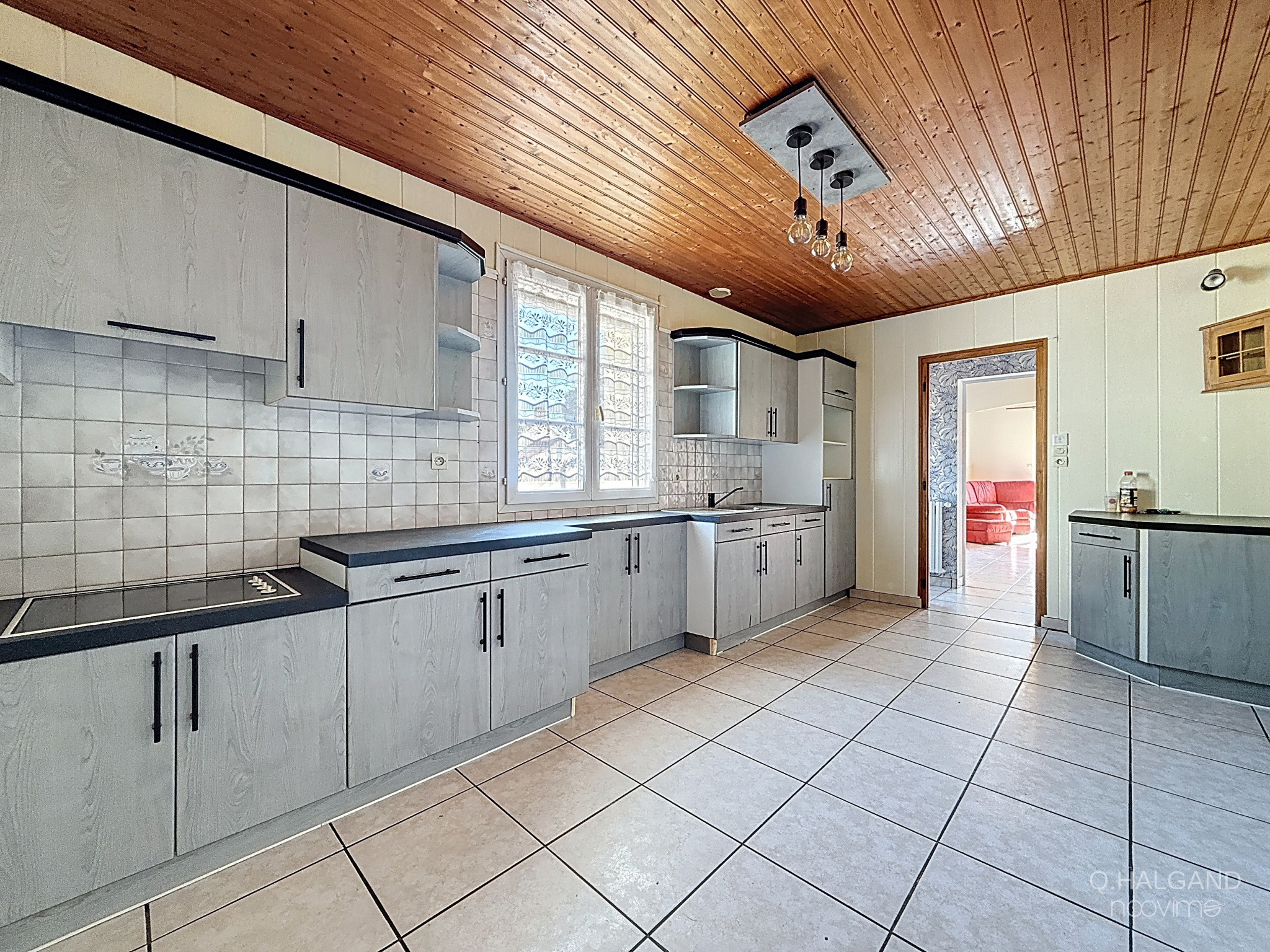 La maison se compose d’un salon-séjour lumineux de 27 m², d’une cuisine séparée aménagée de 16 m², ainsi que d’une arrière-cuisine de 9 m², offrant de belles possibilités d’aménagement ou de rangement.