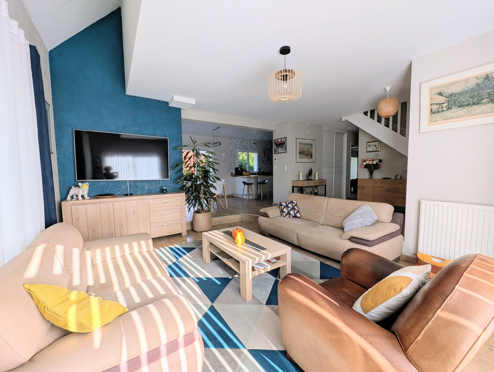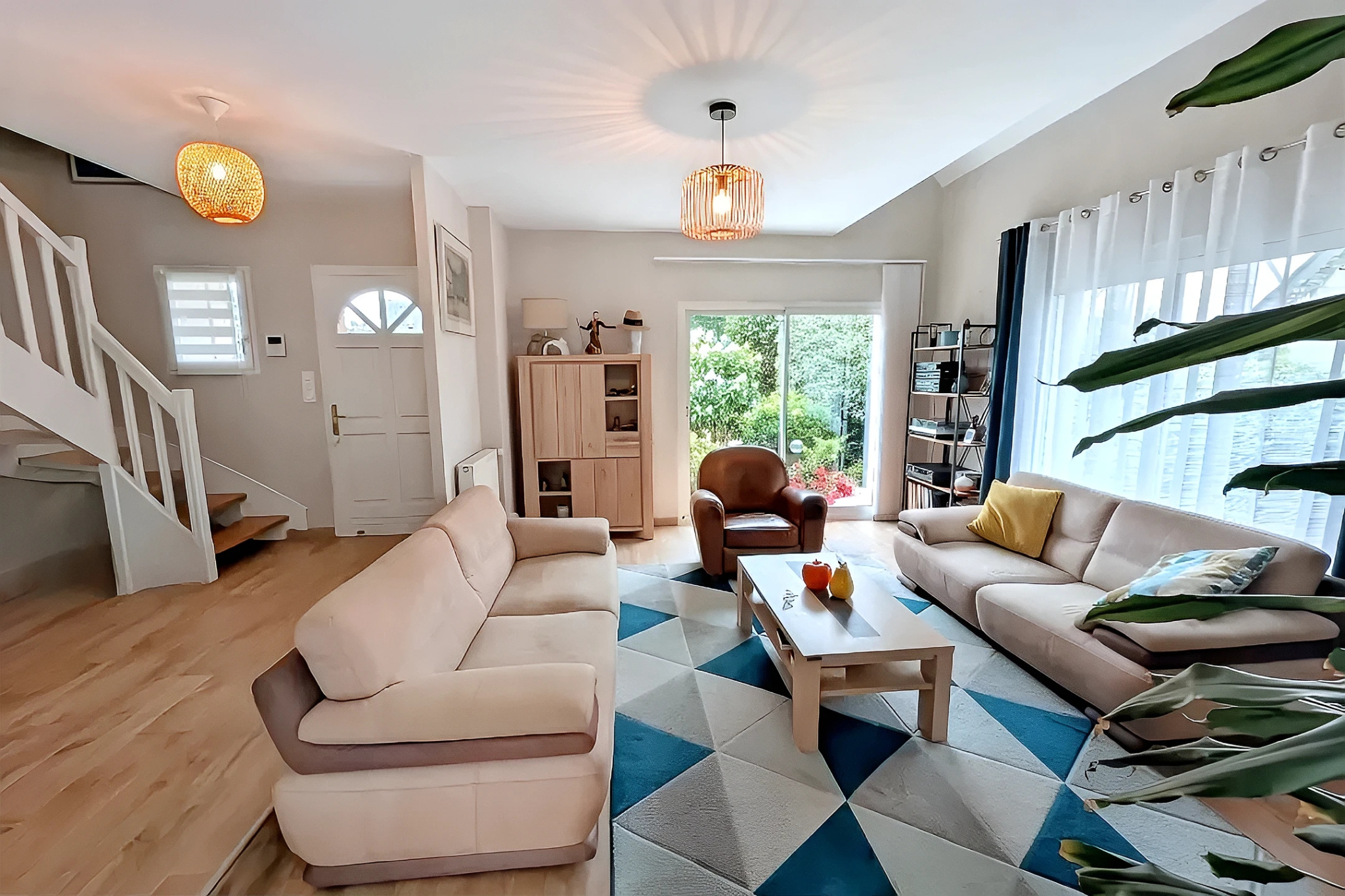 Entrée donnant sur salon-séjour, lumière traversante, avec cuisine ouverte aménagée et équipée, avec accès direct à une terrasse et au jardin clos de 1 300 m².
