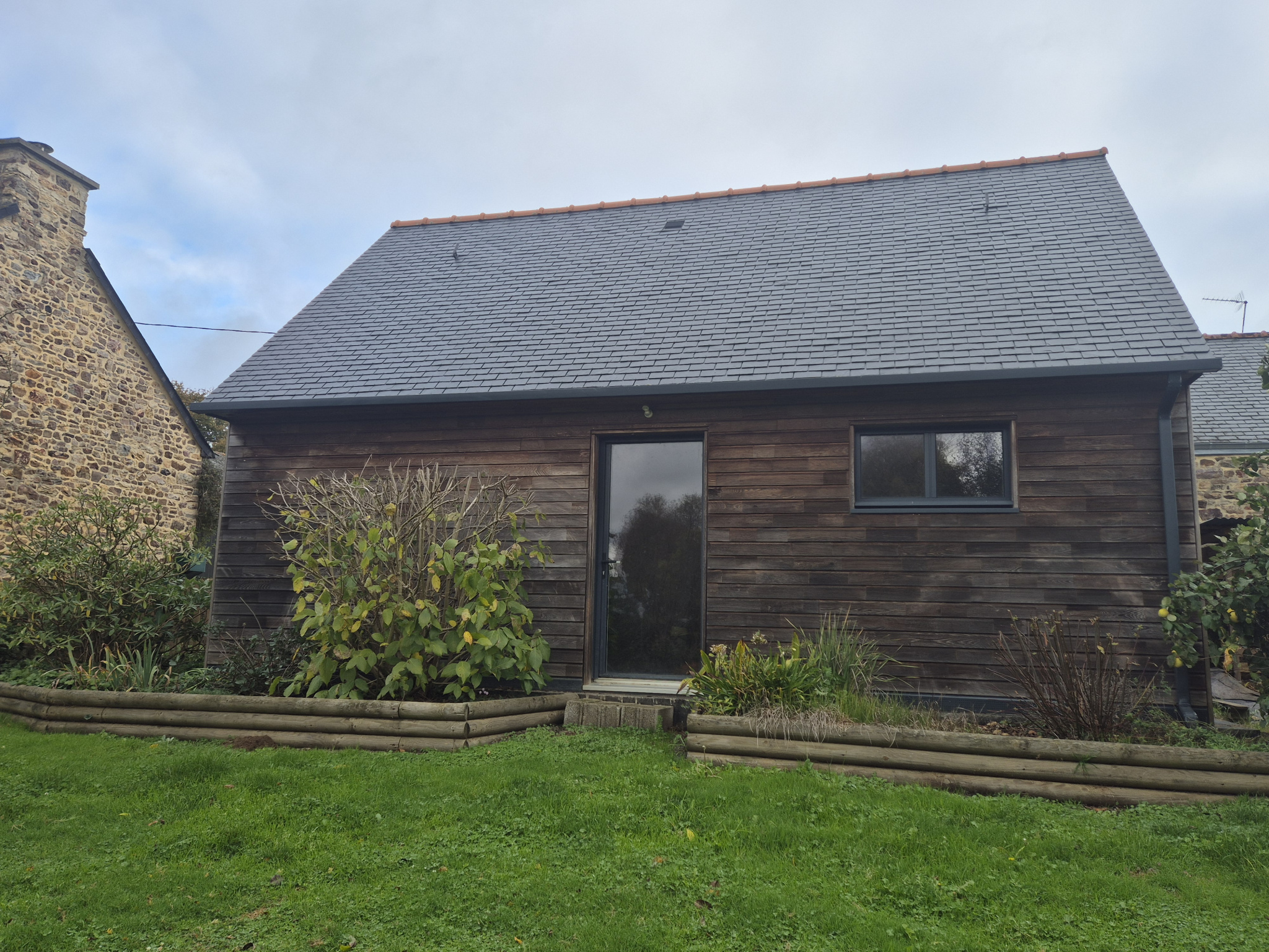 Elle comprend, une entrée, une cuisine aménagée et equipée ouverte sur le salon, un salon salle à manger avec poele à bois exposé sud et donnant sur le jardin,