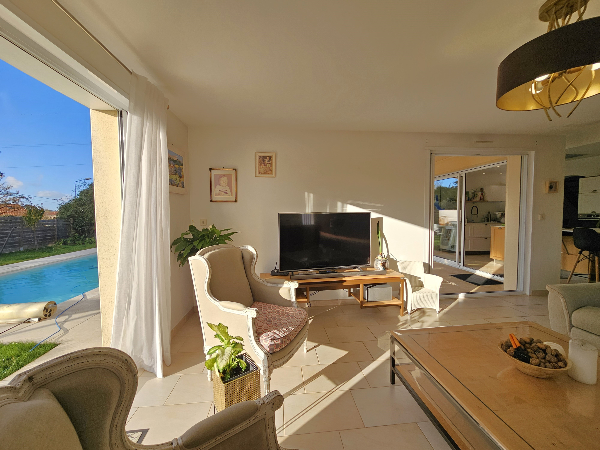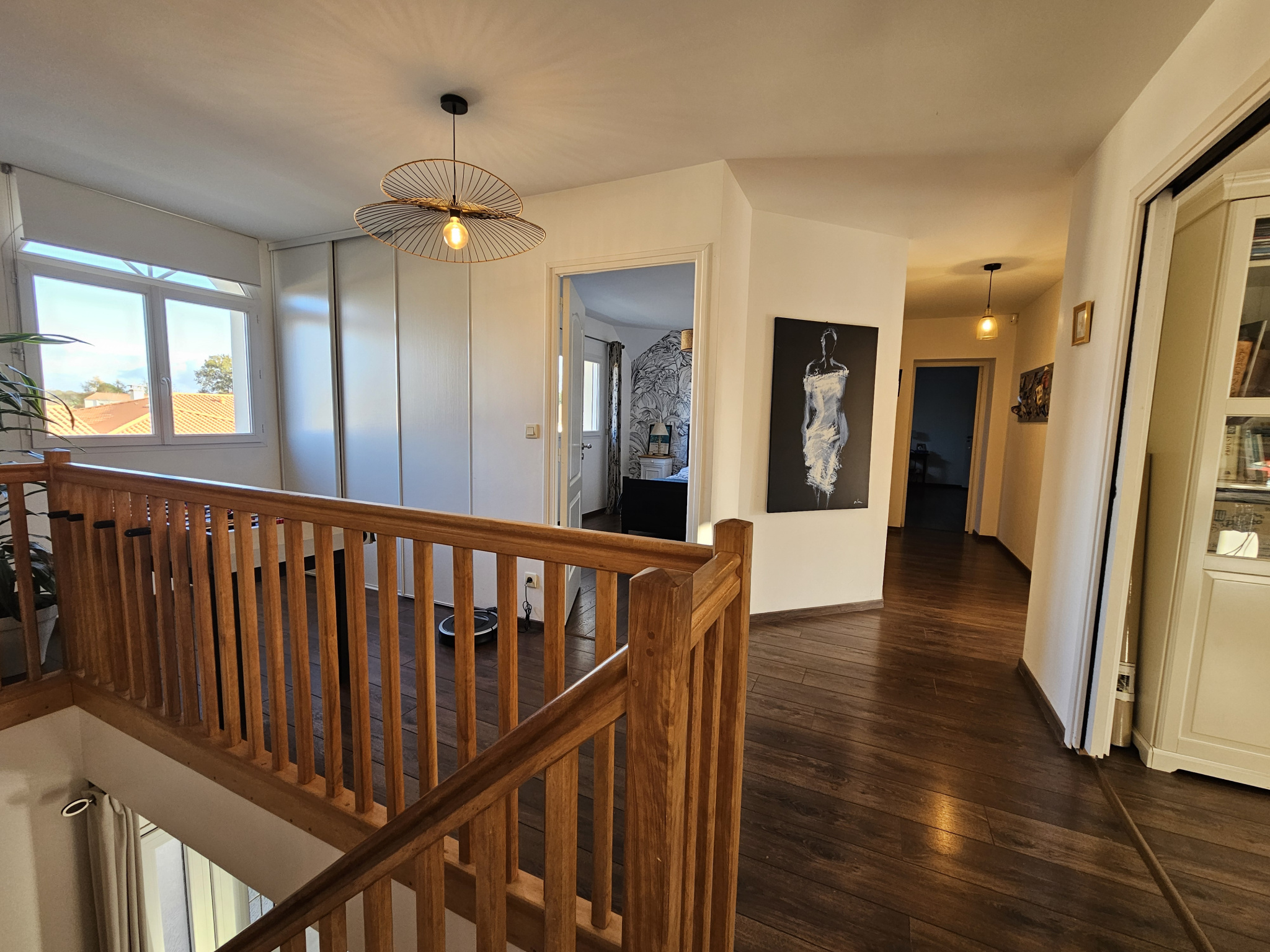Lumineuse, très spacieuse et bien distribuée, tels sont les qualificatifs de cette maison de 2008 destinée à une grande famille. L'entrée s'ouvre sur un vaste espace de vie composé d'un séjour, d'une cuisine aménagée et équipée, d'un salon TV et vous profiterez d'une chambre de plain-pied avec salle d'eau. L'étage est partagé par une suite parentale, trois grandes chambres et salle de bains, un bureau et une belle terrasse proprice au farniente. Une arrière cuisine, un grand garage complètent l'ensemble.