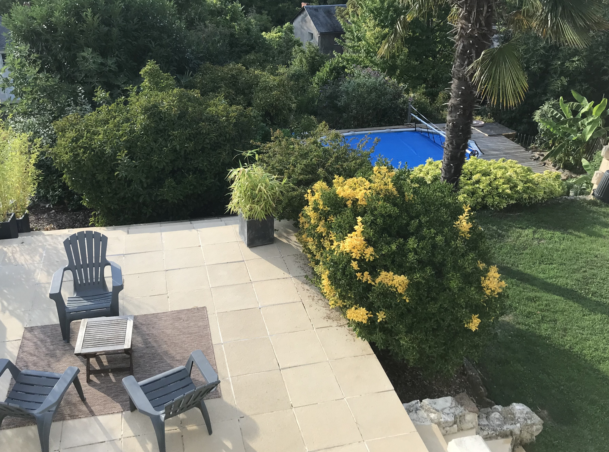 À l’extérieur, le décor est tout aussi séduisant. La propriété bénéficie d’un jardin soigneusement entretenu, sans aucun vis-à-vis, où la terrasse se mêle à une végétation méditerranéenne. La piscine s’intègre naturellement dans cet espace calme et chaleureux, créant un véritable lieu de détente.