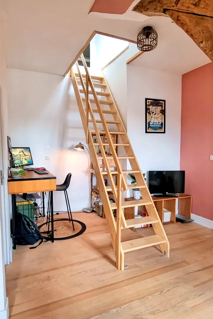 À l’étage, une spacieuse mezzanine offre un espace idéal pour un bureau ou un salon d’appoint. Vous y trouverez également une chambre avec placard, une salle de bain et un second WC.