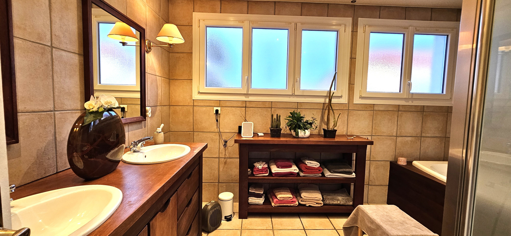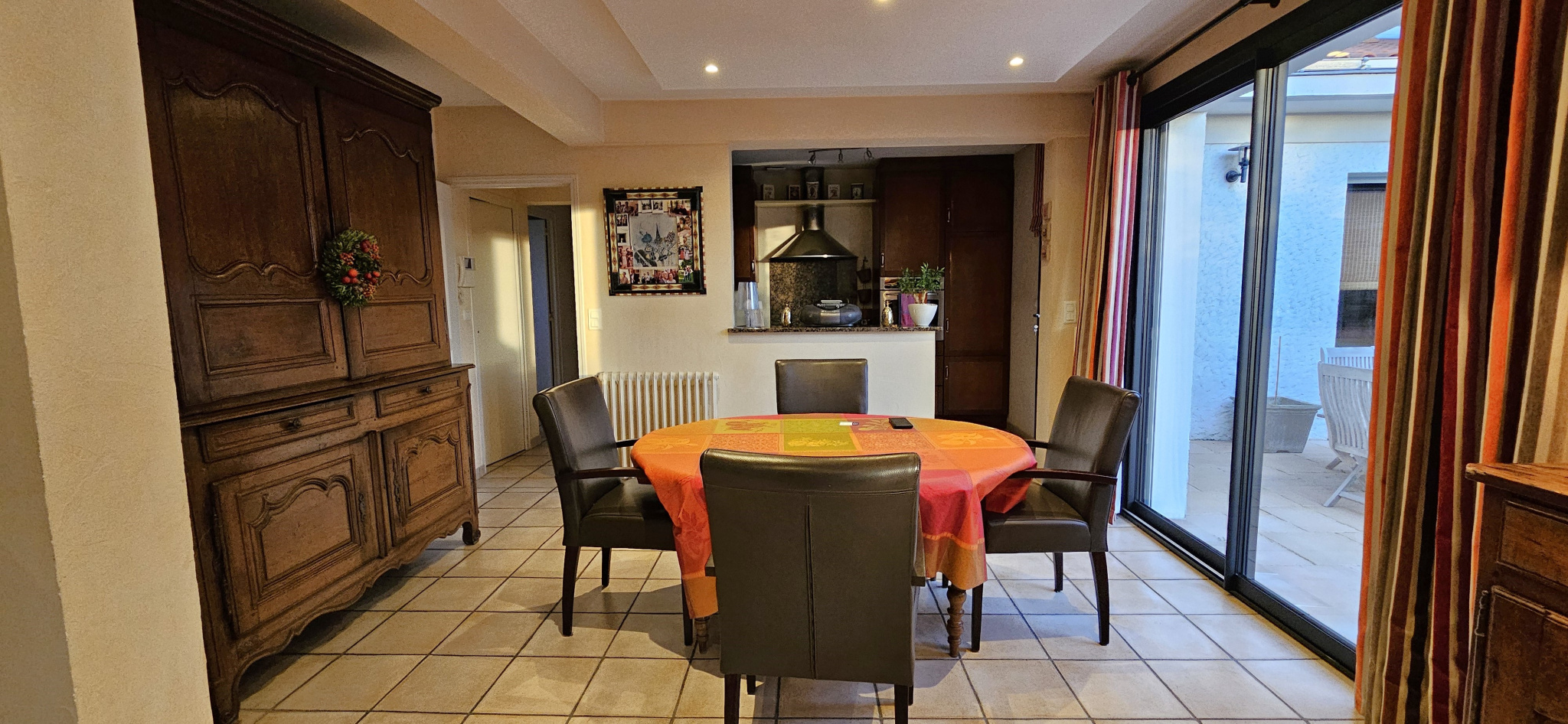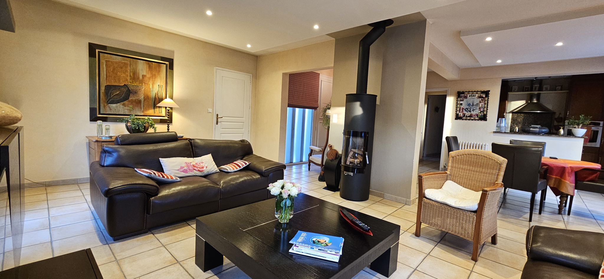 L'entrée s'ouvre sur un salon très lumineux équipé d'un poele à bois et un espace repas contigü à la cuisine aménagée et équipée. Le couloir dessert une buanderie, trois chambres, une salle de bains avec douche à l'italienne et baignoire, un WC. Une cave et un très grand garage de 44m² viennent en sus.