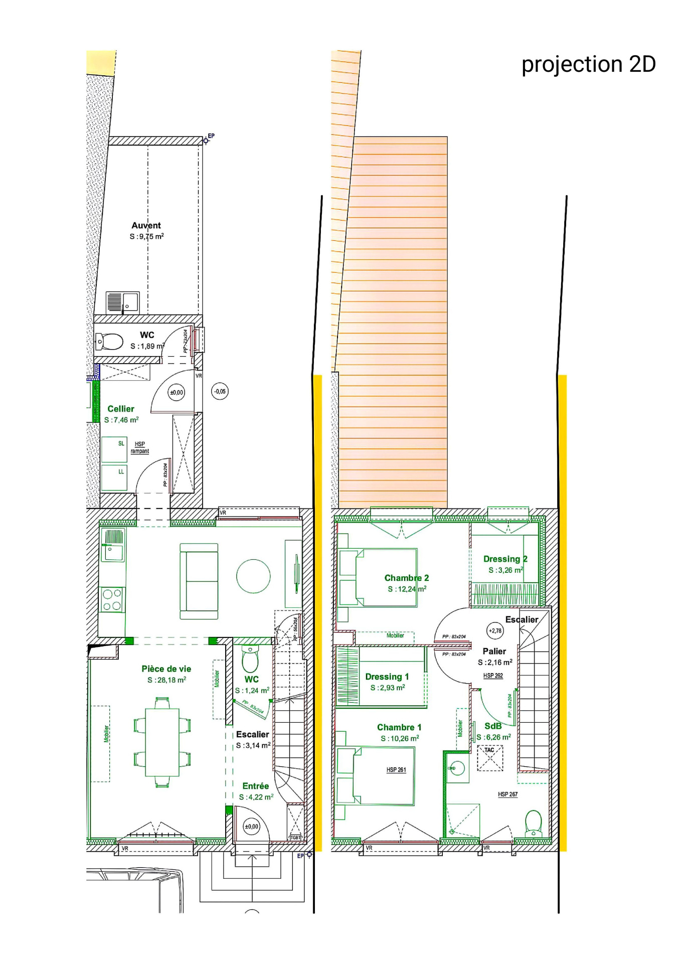 Une future cuisine-salle à manger avec sa cheminée, ouverte directement sur un salon. au même niveau vous trouverez des WC, une arrière cuisine donnant sur une cour privée avec préau.
