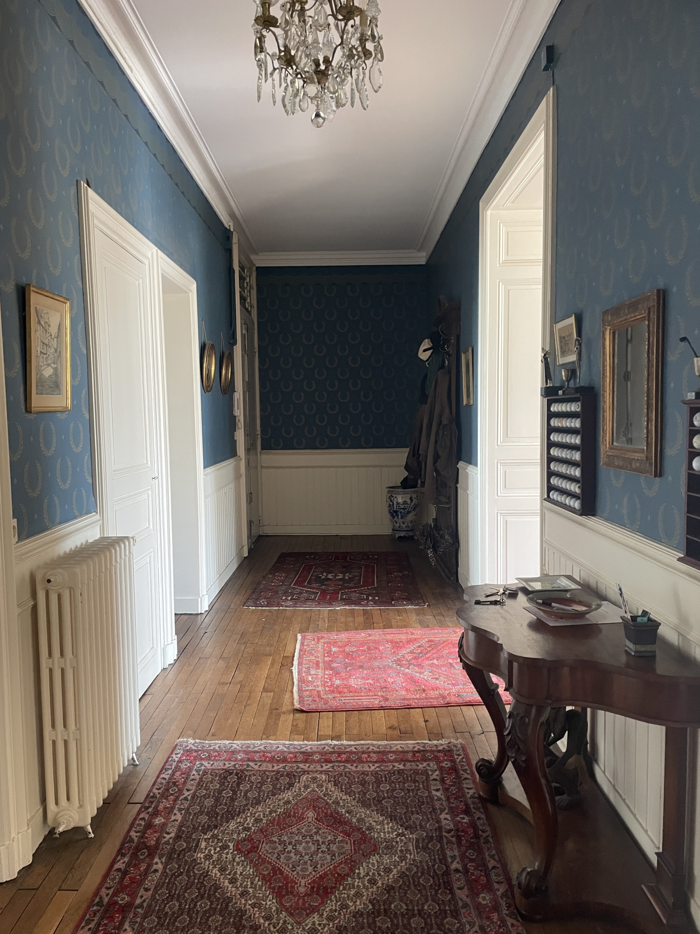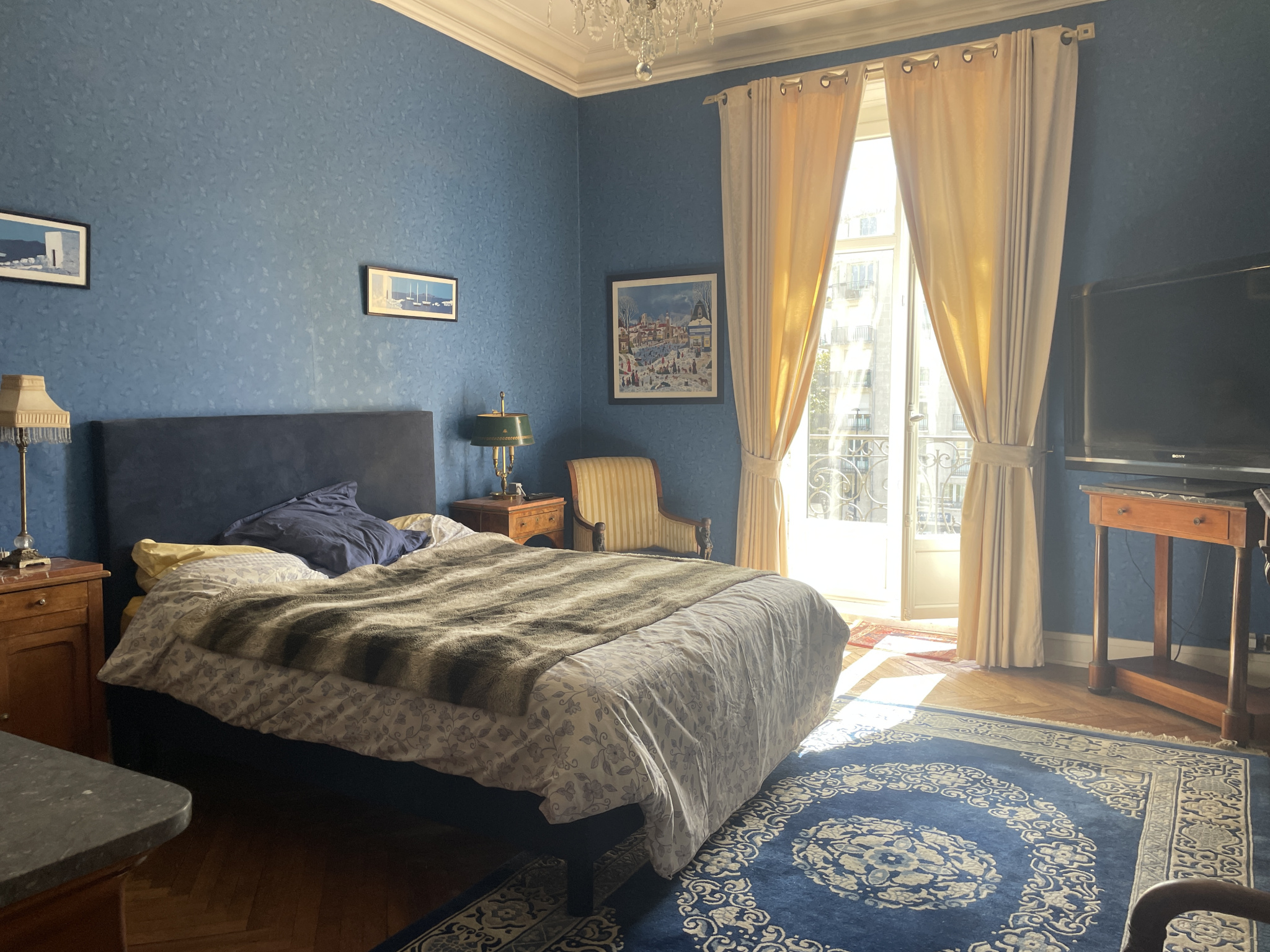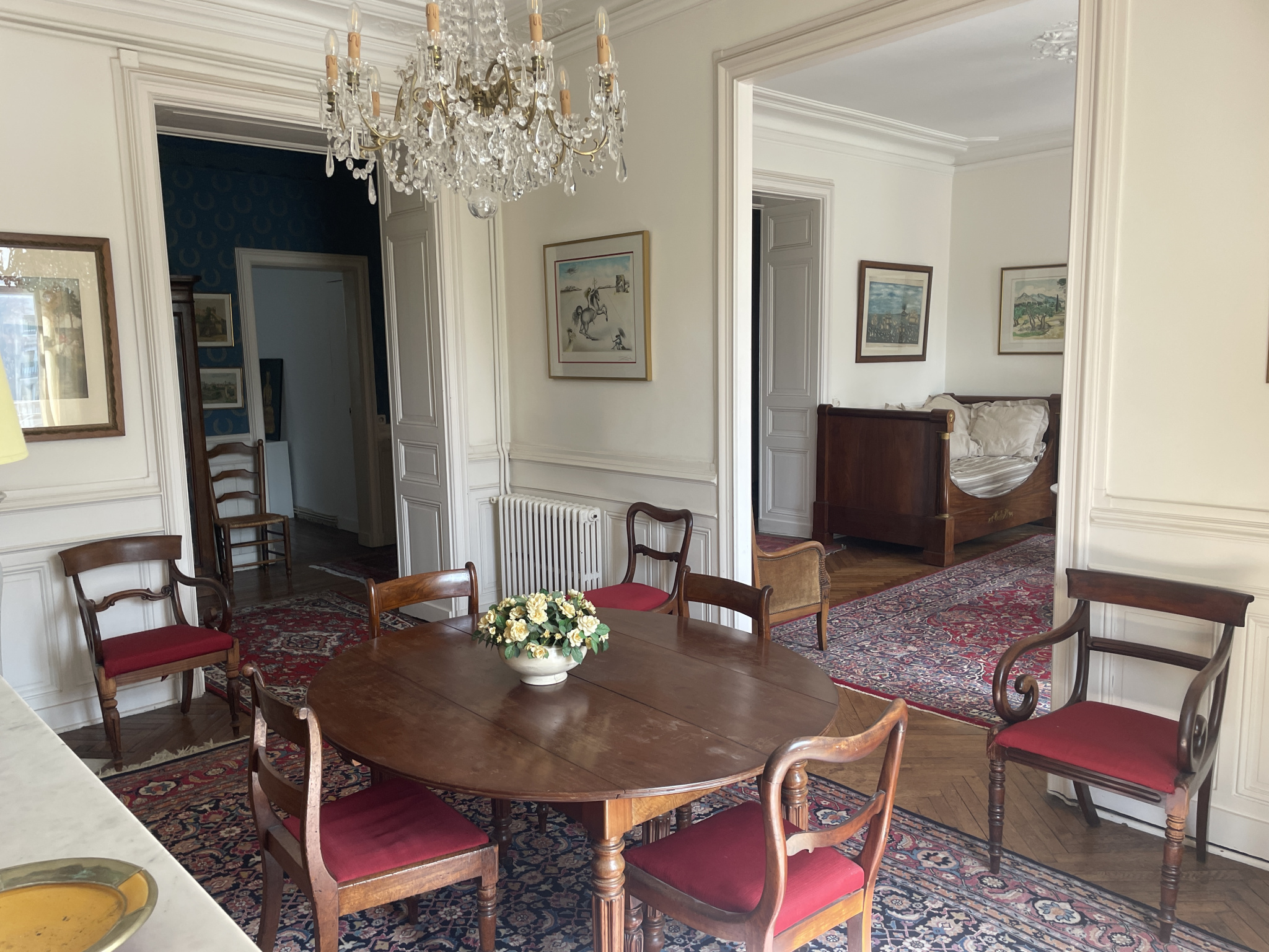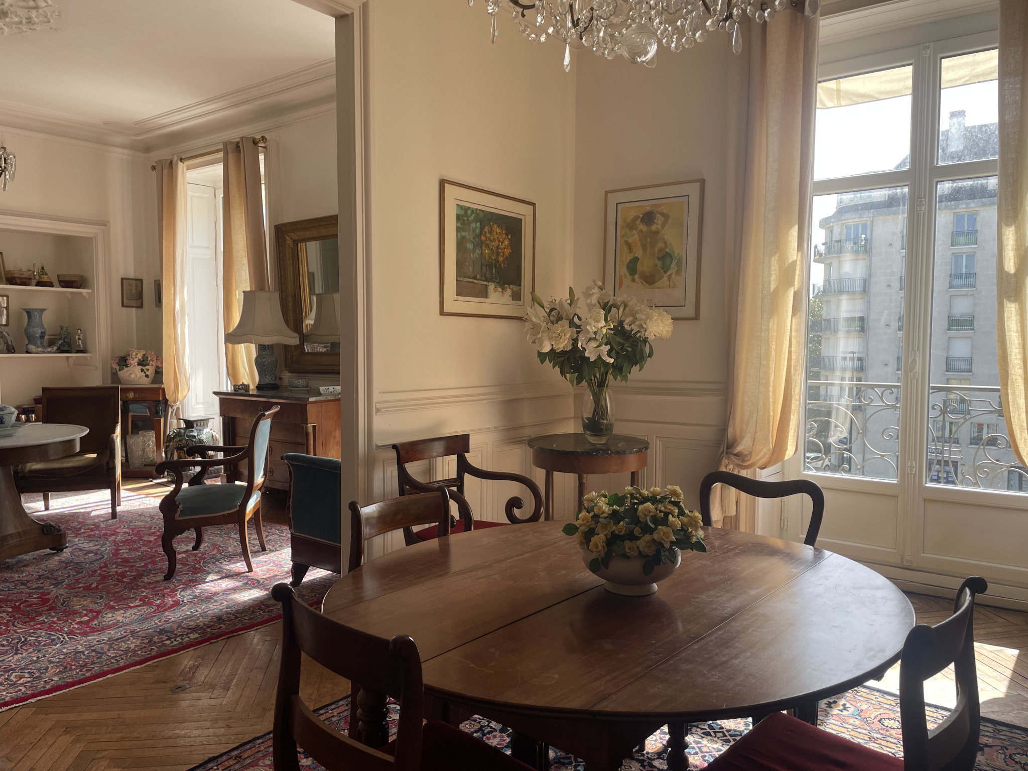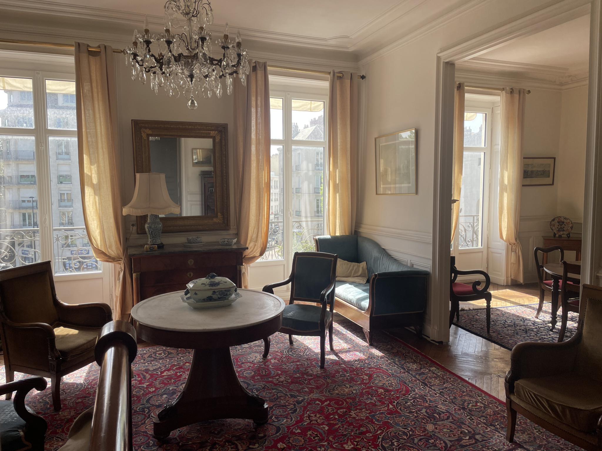 Le double salon-séjour en enfilade, baigné de lumière, est sublimé par des lustres, des parquets d'époque, des moulures et des cheminées de marbre.