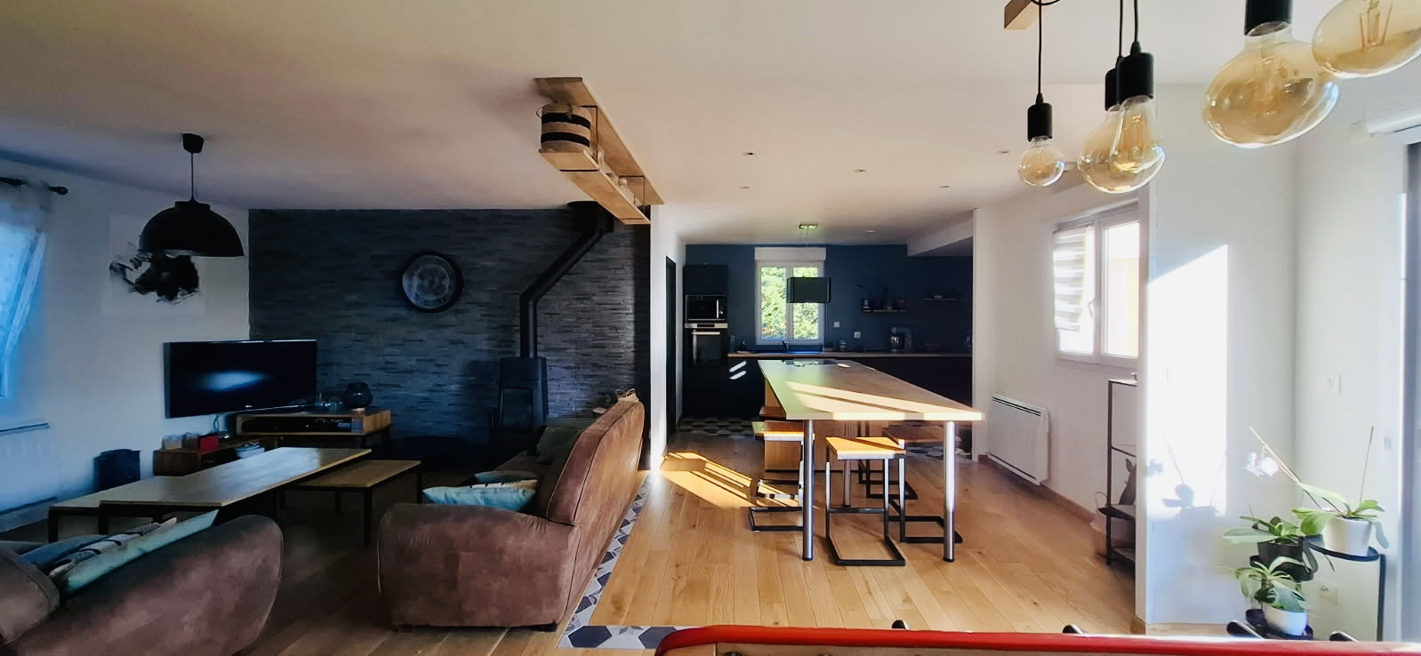 Elle se compose d'une entrée avec placards, un vaste espace de vie convivial comprenant une grande cuisine ouverte équipée et aménagée (ENVIA), ainsi qu'un séjour- Salon équipé d'un poêle à bois, offrant un confort optimal en toute saison, un espace bureau.