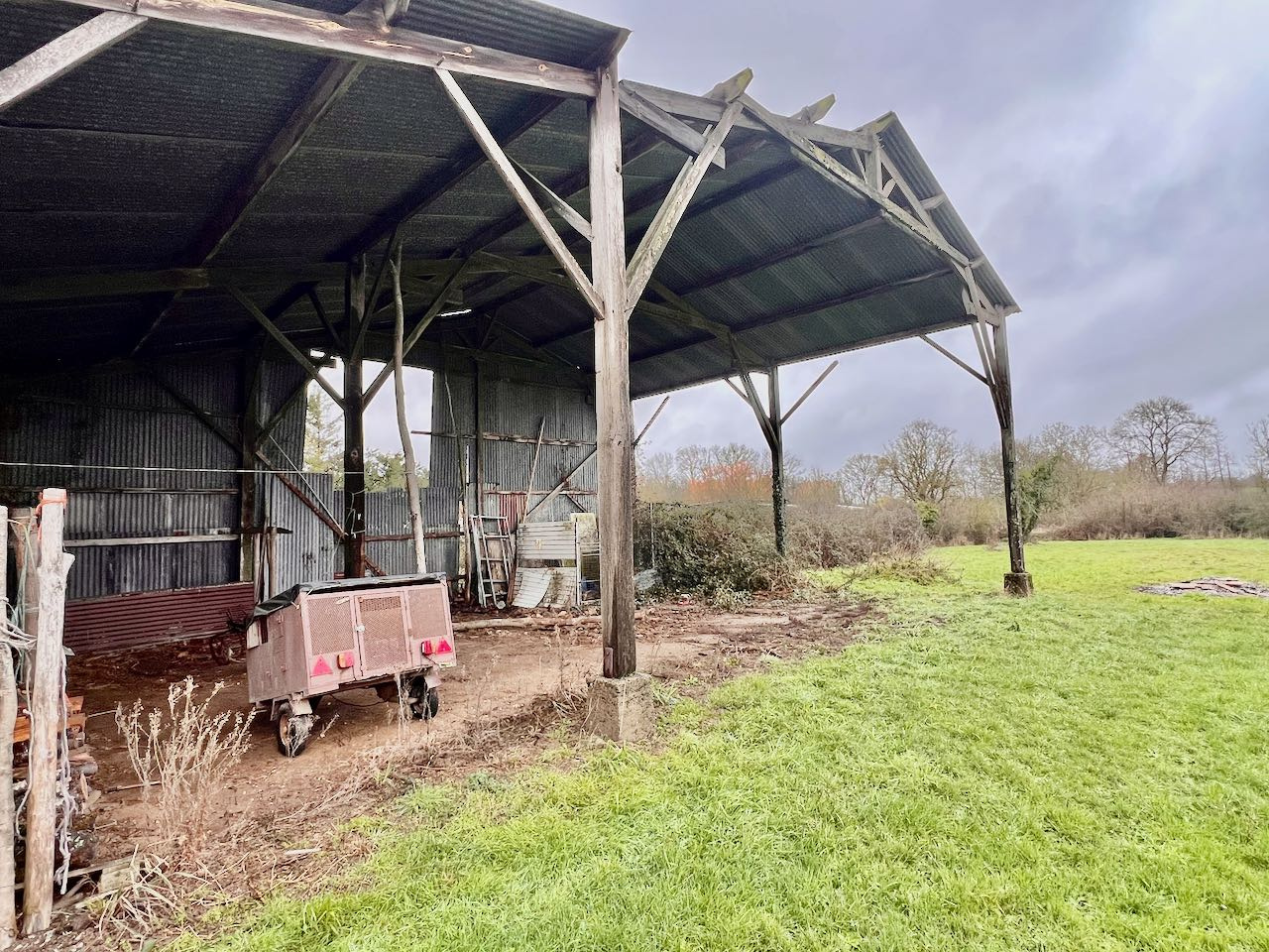 À l’extérieur, la propriété dispose de nombreuses dépendances : une maison en partie en ruine offrant un potentiel de rénovation, un garage, des ateliers, une salle des fête ou grand atelier indépendant, ainsi que plusieurs hangars en tôle, idéals pour le stockage, les activités artisanales ou agricoles.