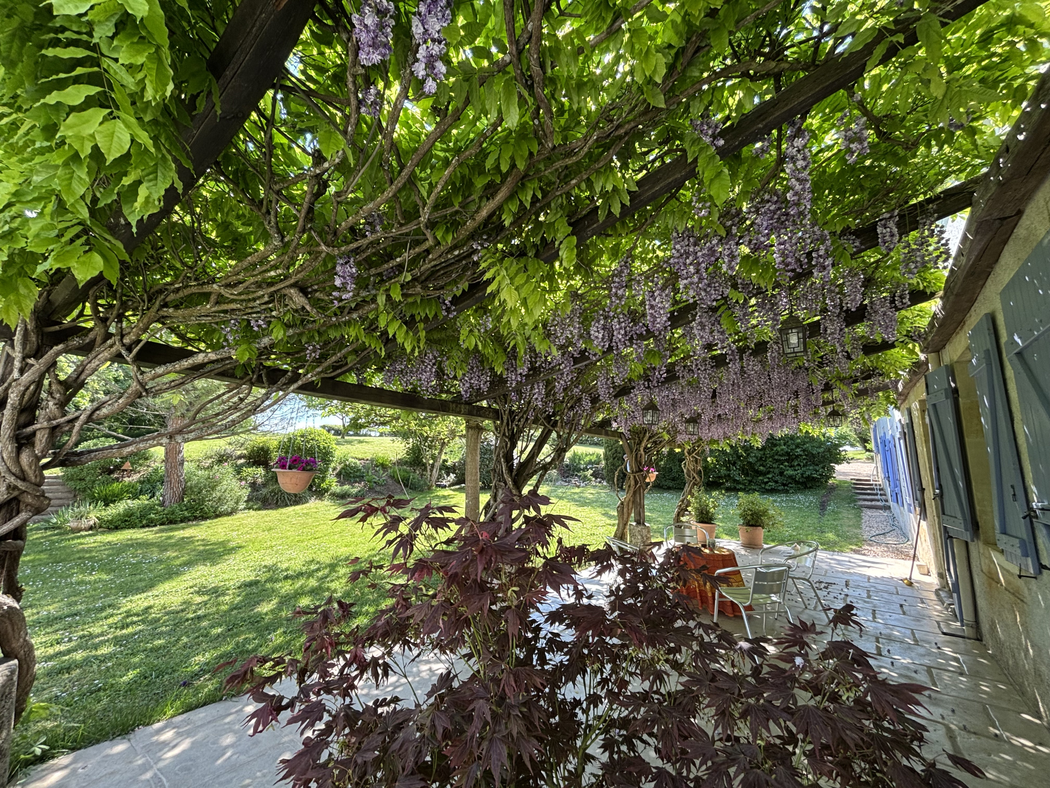 Cuisine aménagée et équipée, ouverte sur une terrasse ombragée par une glycine