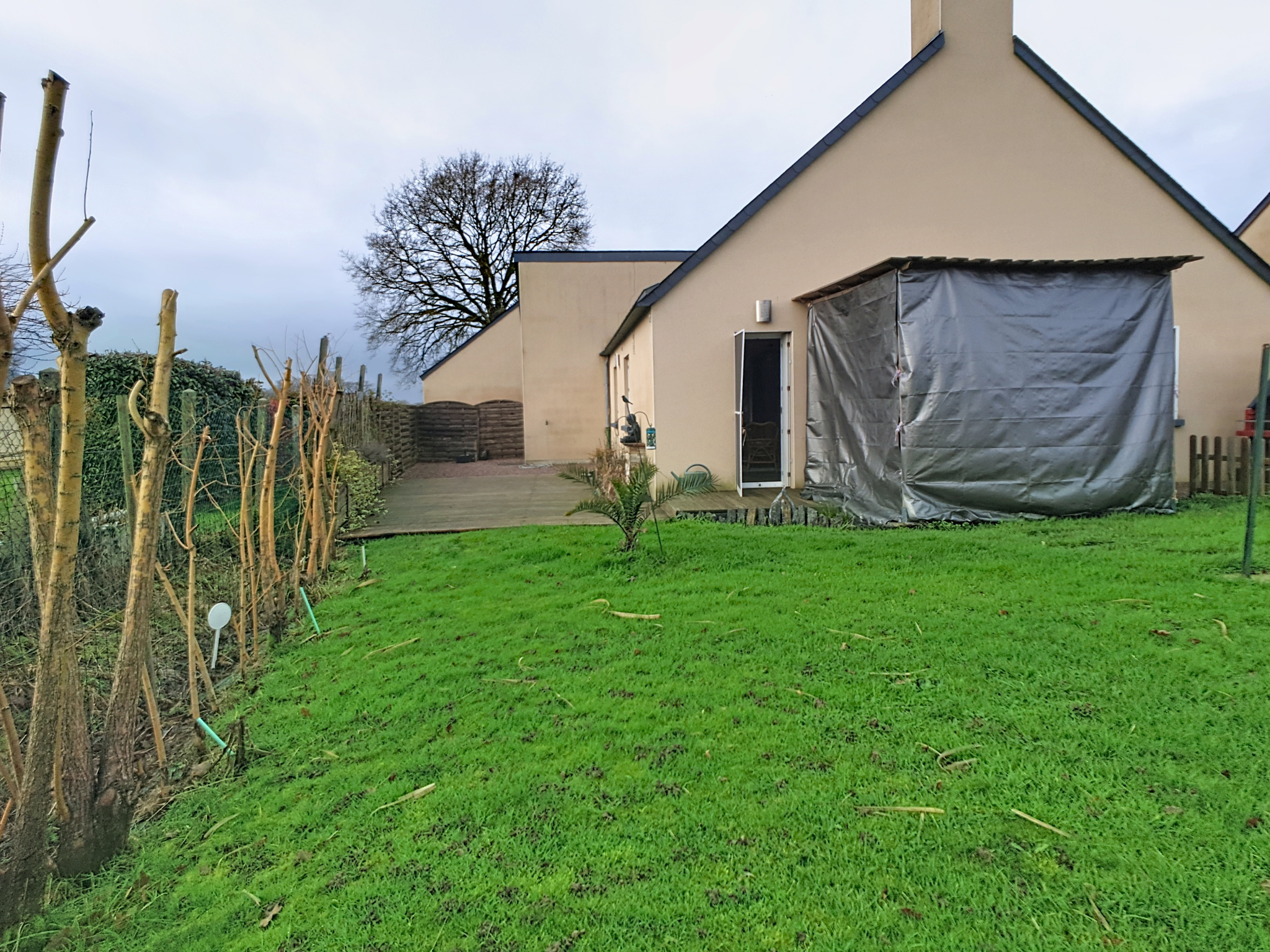 En annexe : un garage, dans le jardin un cabanon, une terrasse avec pergola.