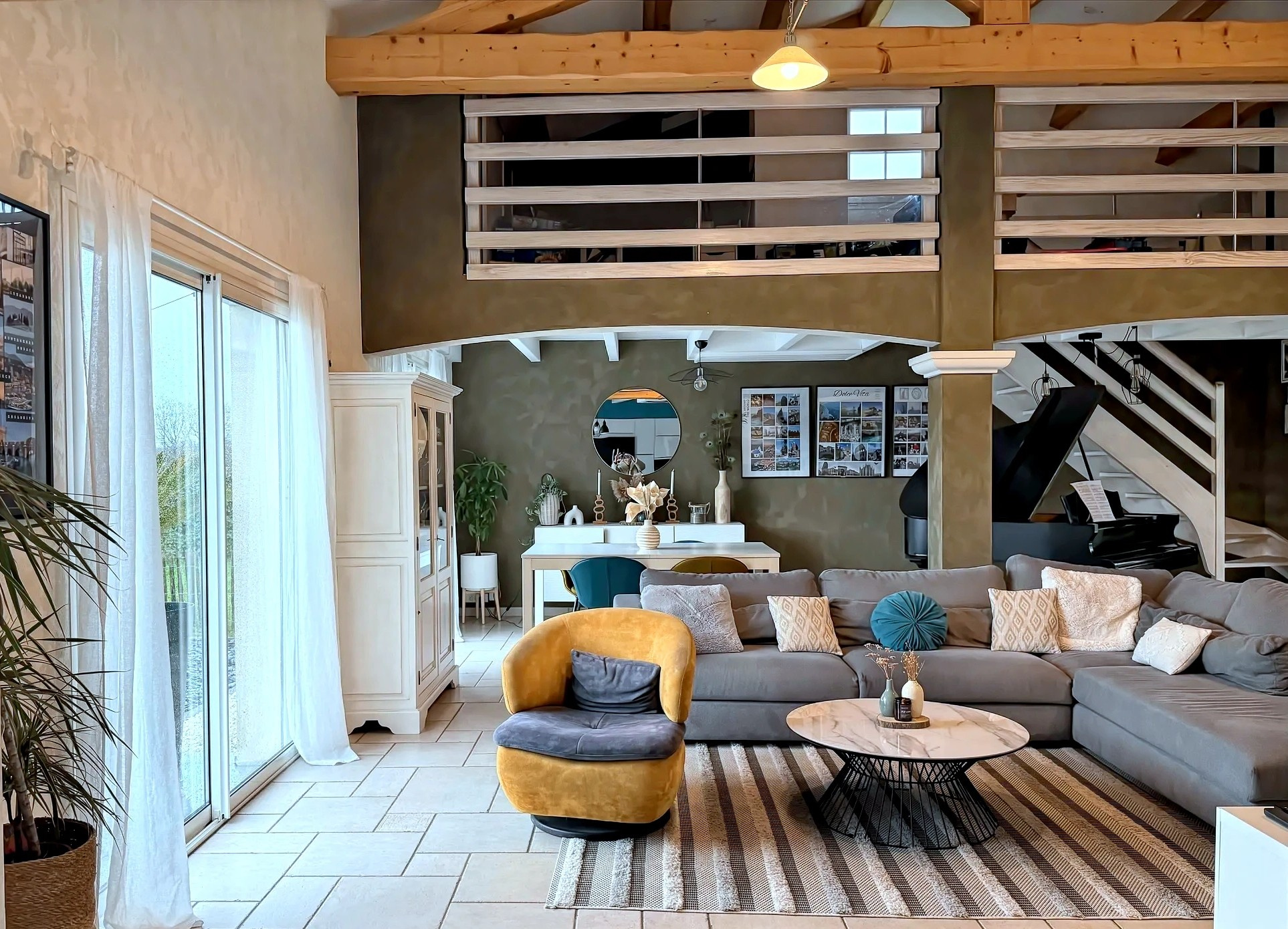 La pièce de vie, spacieuse et baignée de lumière, s’ouvre généreusement sur le jardin et la terrasse.