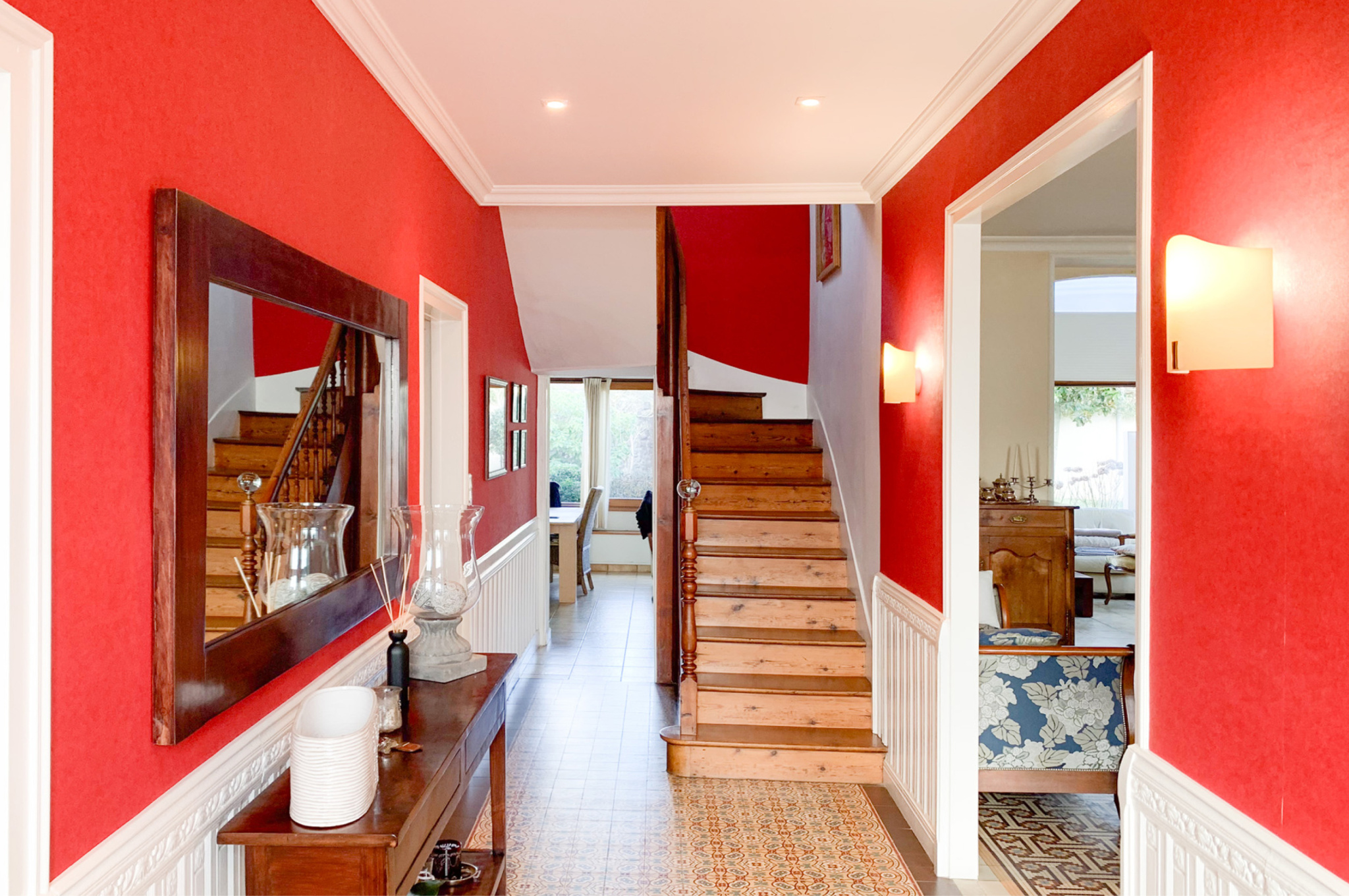 Dès l’entrée, la maison séduit par ses matériaux nobles : moulures, carreaux de ciment, parquets anciens, cheminées en marbre et belles hauteurs sous plafond.