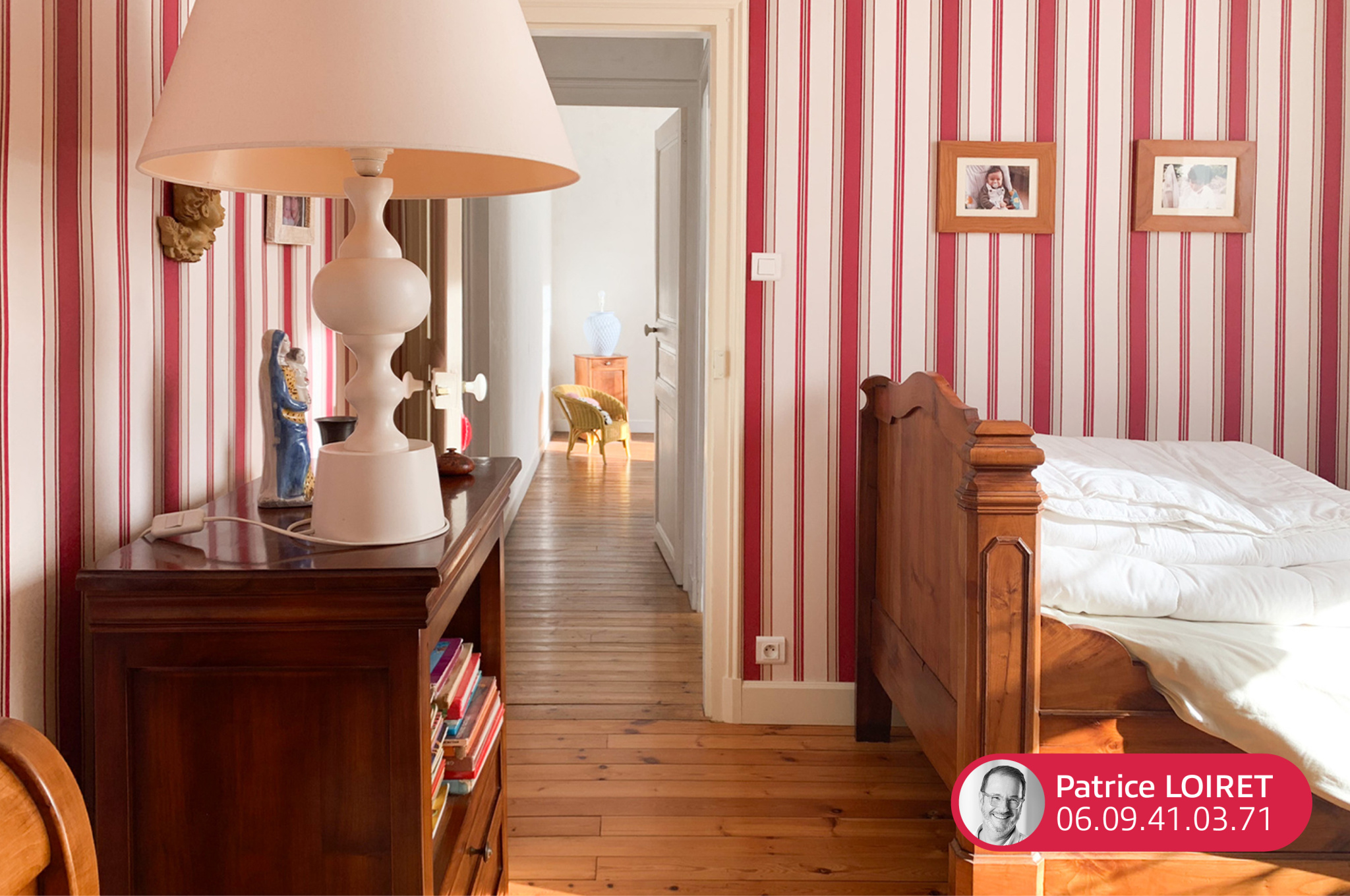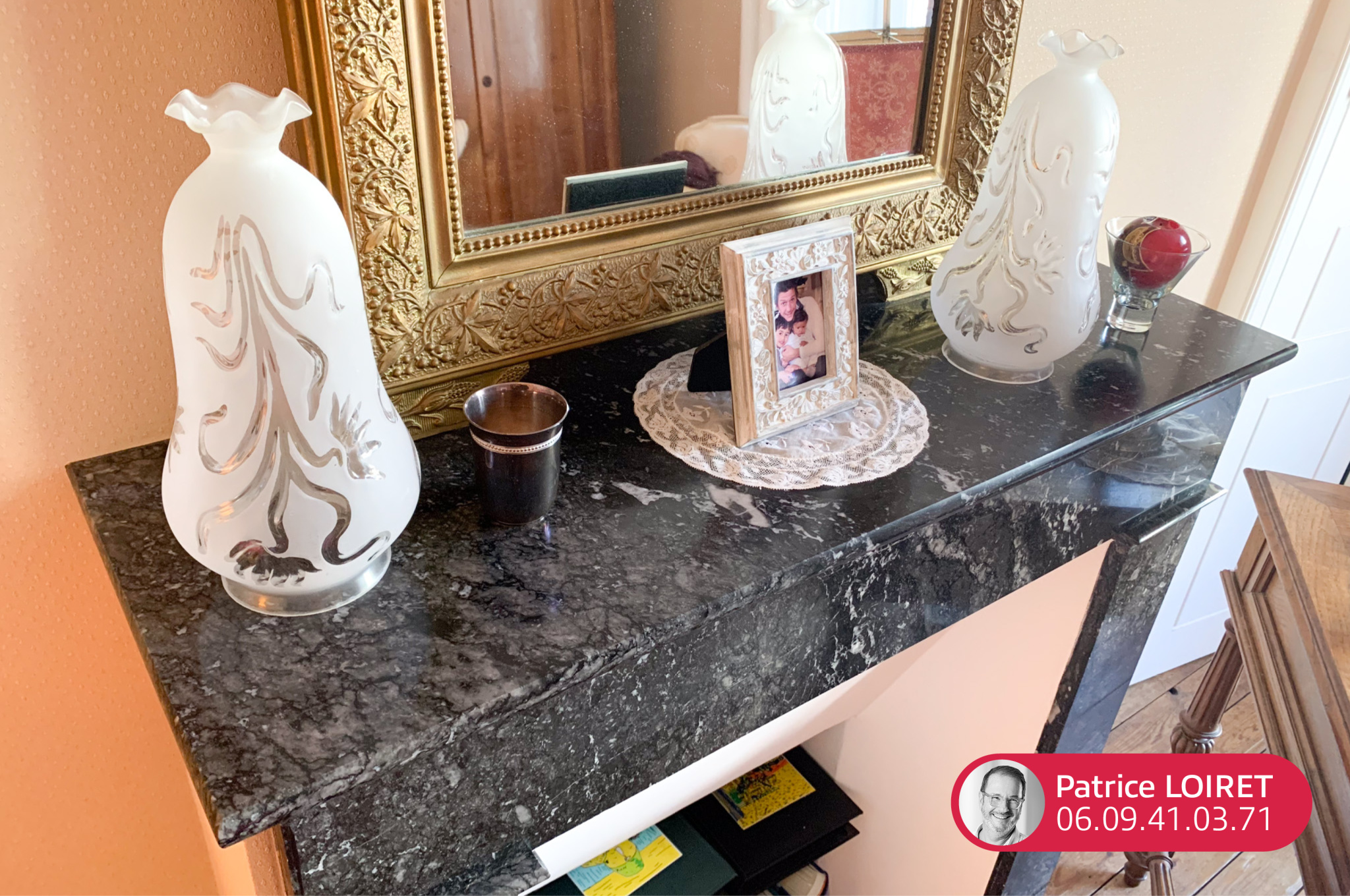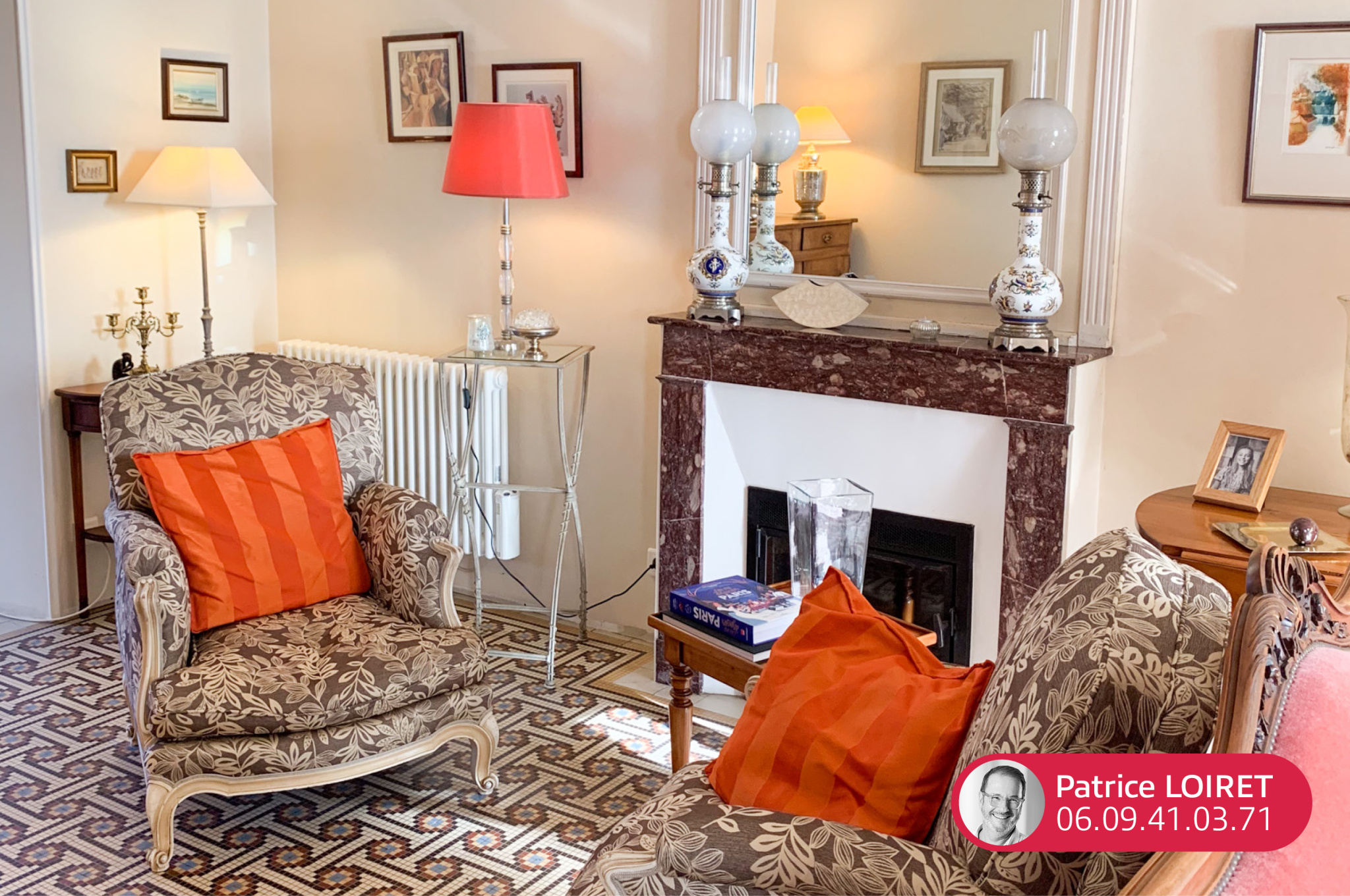 Dès l’entrée, la maison séduit par ses éléments d’époque soigneusement conservés : parquets anciens, carreaux de ciment, cheminées en marbre et belles hauteurs sous plafond.