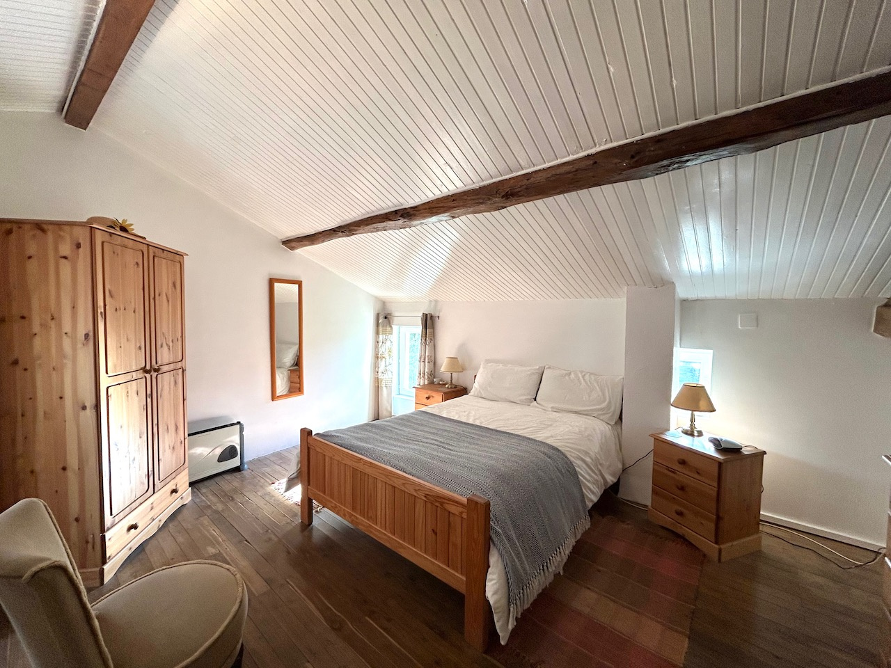This charming traditional longère comprises a main house with two bedrooms and a study, carefully maintained and improved over the years. The main house features a spacious open-plan living area with kitchen and dining space, both warm and functional, with a traditional range cooker at one end and a wood-burning stove at the other, although these are rarely needed thanks to double glazing and efficient underfloor heating. The ground floor also includes a shower room and separate WC. Upstairs, you will find two generous double bedrooms, a bathroom with bathtub and shower over, separate WC, as well as a study which could also be used as a small additional bedroom. The layout is comfortable and flexible, making it ideal as a main residence or a holiday home.