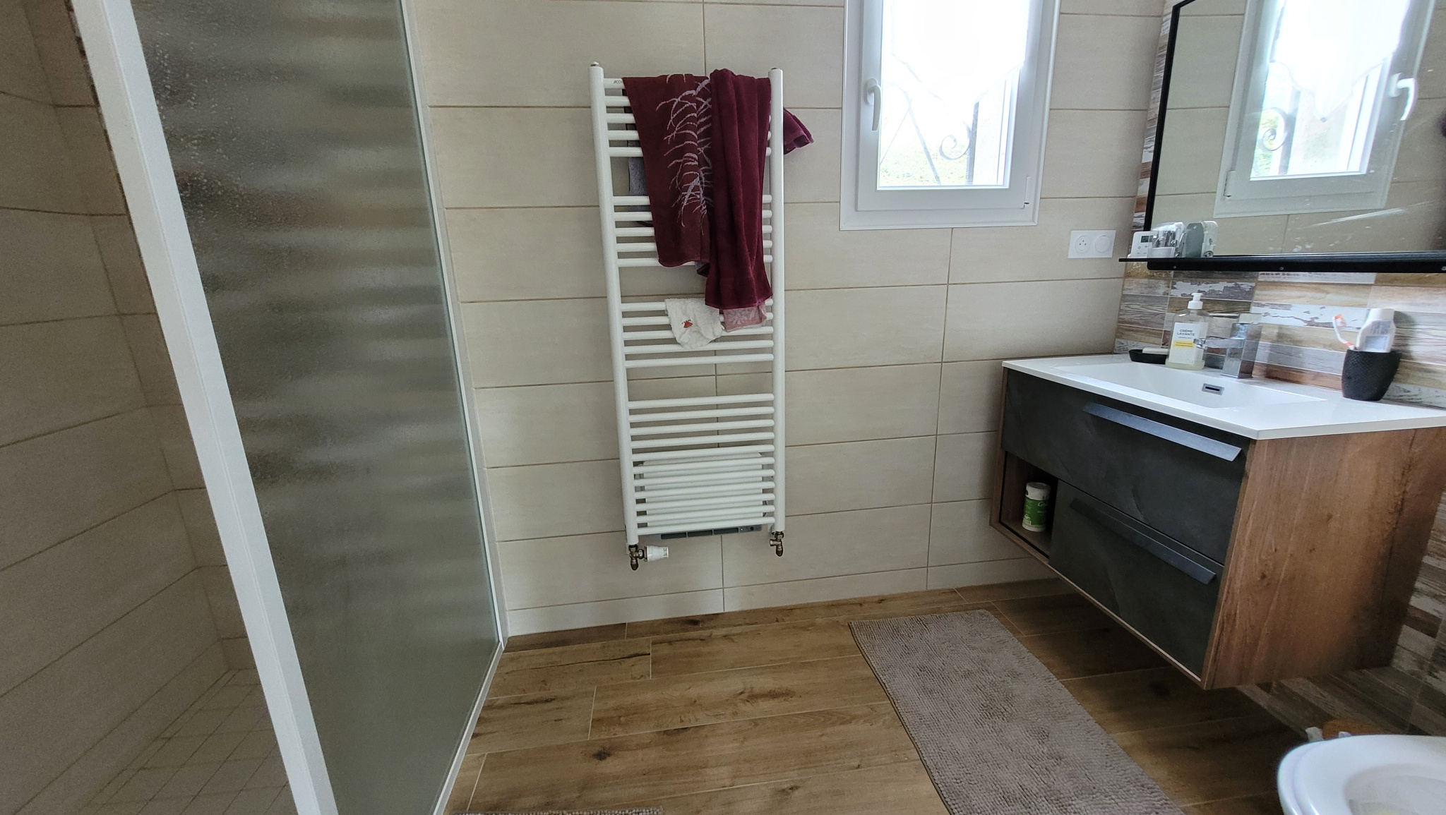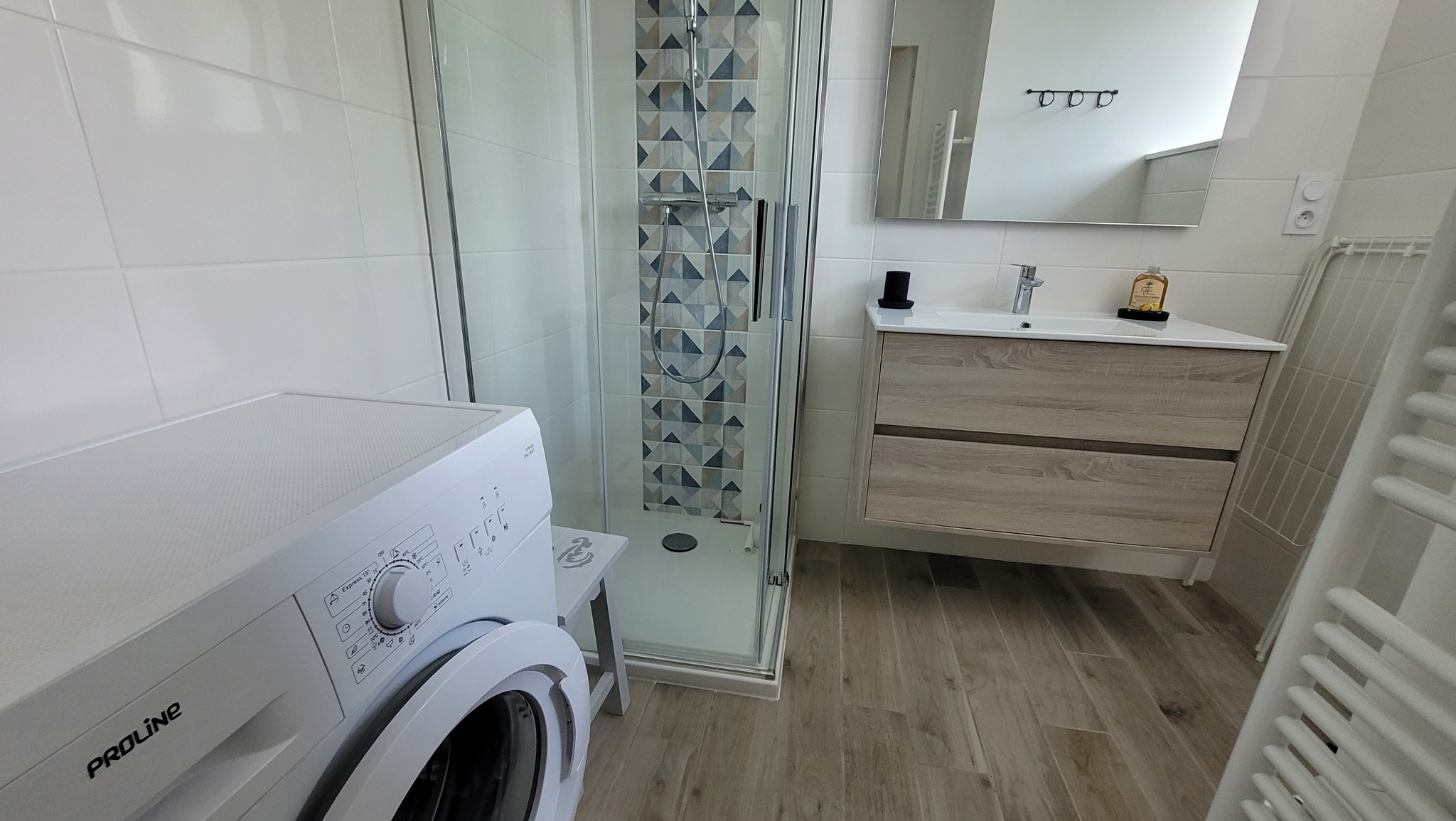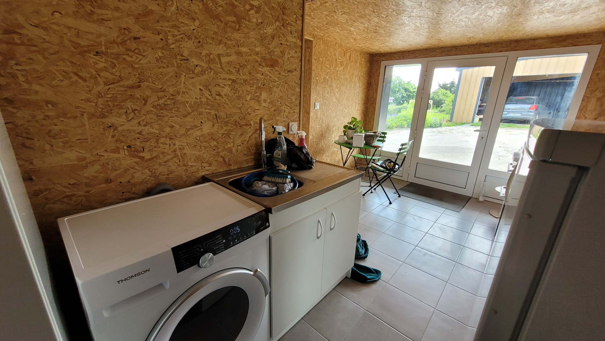 - RDC : Séjour-salon-cuisine équipée, salle d’eau (douche, vasque, lave-linge), WC séparé