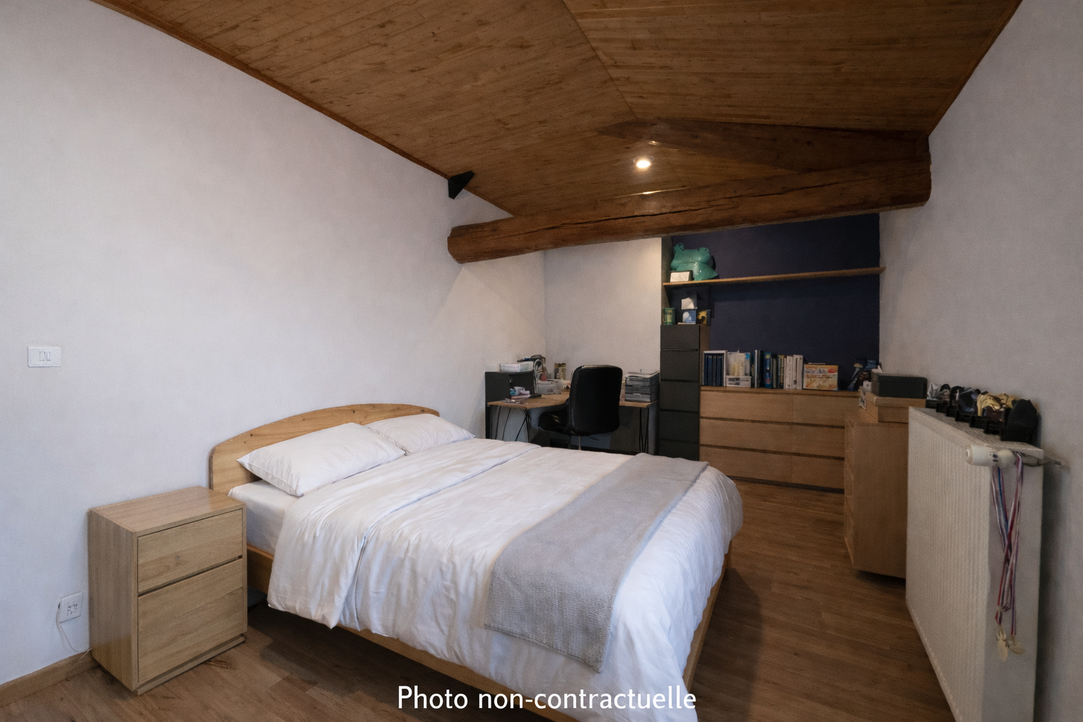 On the ground floor, the entrance leads to a fitted independent kitchen and a bright, spacious living area of over 35 m² featuring a wood-burning stove installed in 2024. A large 28 m² bedroom offers comfortable single-level living, complete with a dressing area and open views over the garden. A bathroom and separate WC complete this level. An attached garage and a utility room provide additional storage space. Heating is provided by an air-to-water heat pump, complemented by an oil-fired boiler.