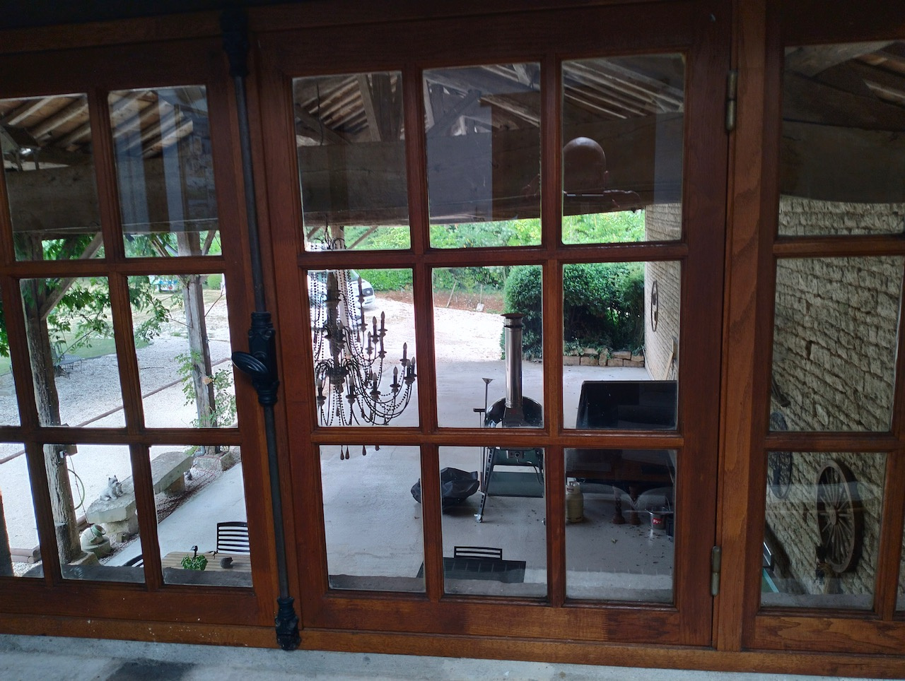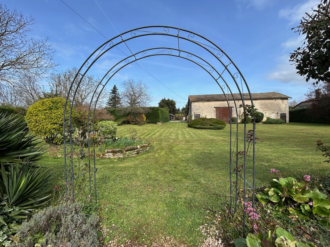 La propriété est accessible par un portail électrique et s’ouvre sur un magnifique jardin soigneusement entretenu. Dès l’arrivée, vous découvrirez une impressionnante terrasse couverte aux superbes poutres apparentes et à la toiture de style cathédrale. Cet espace spectaculaire est parfaitement adapté pour accueillir un camping-car, tout en conservant un espace de réception avec pourquoi pas une cuisine d'été ouverte sur le parc et le terrain de pétanque. Un élégant lustre suspendu à la charpente apporte une touche de caractère supplémentaire.