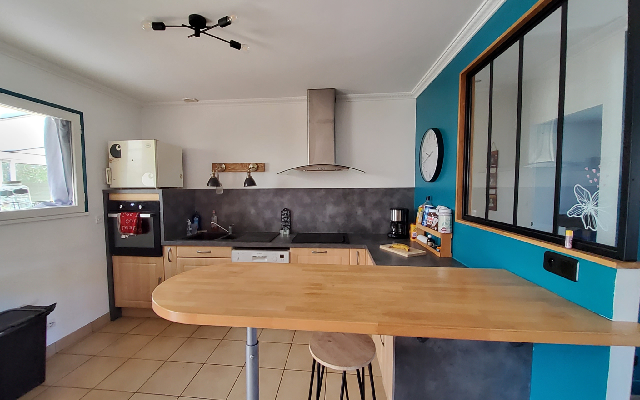 Elle se compose d’un espace de vie lumineux de plus de 30 m², avec salon-séjour et cuisine ouverte, agrémenté d’un poêle à bois pour une ambiance chaleureuse. Vous trouverez également deux chambres, une salle d’eau, des WC séparés ainsi qu’un garage.