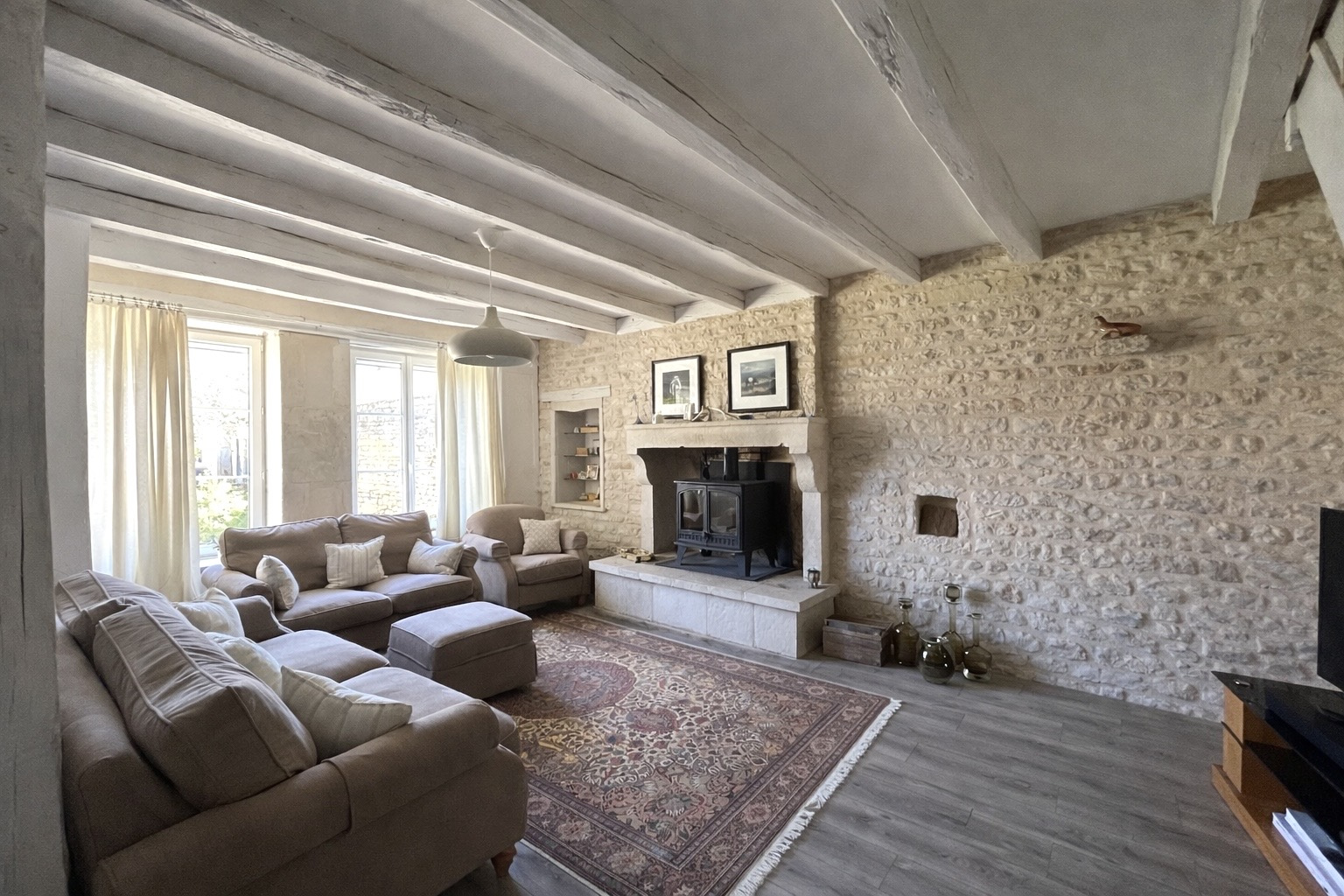 Le salon, cosy et authentique, est sublimé par une cheminée en pierre équipée d’un poêle à bois récent et performant, créant un espace de vie chaleureux et accueillant.