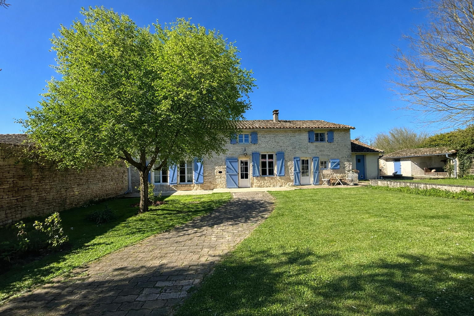 Accessed via electric gates, this charming property immediately impresses with its privacy and tranquil setting. A long tree-lined gravel driveway leads you through mature gardens to the house and its beautiful stone outbuildings, creating a real sense of seclusion.