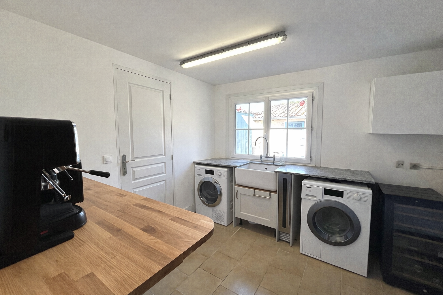The main house is full of character, enhanced by its charming Provençal blue shutters. Inside, you are welcomed into a large, bright dining room filled with natural light thanks to its large openings, light tones, and tiled flooring.