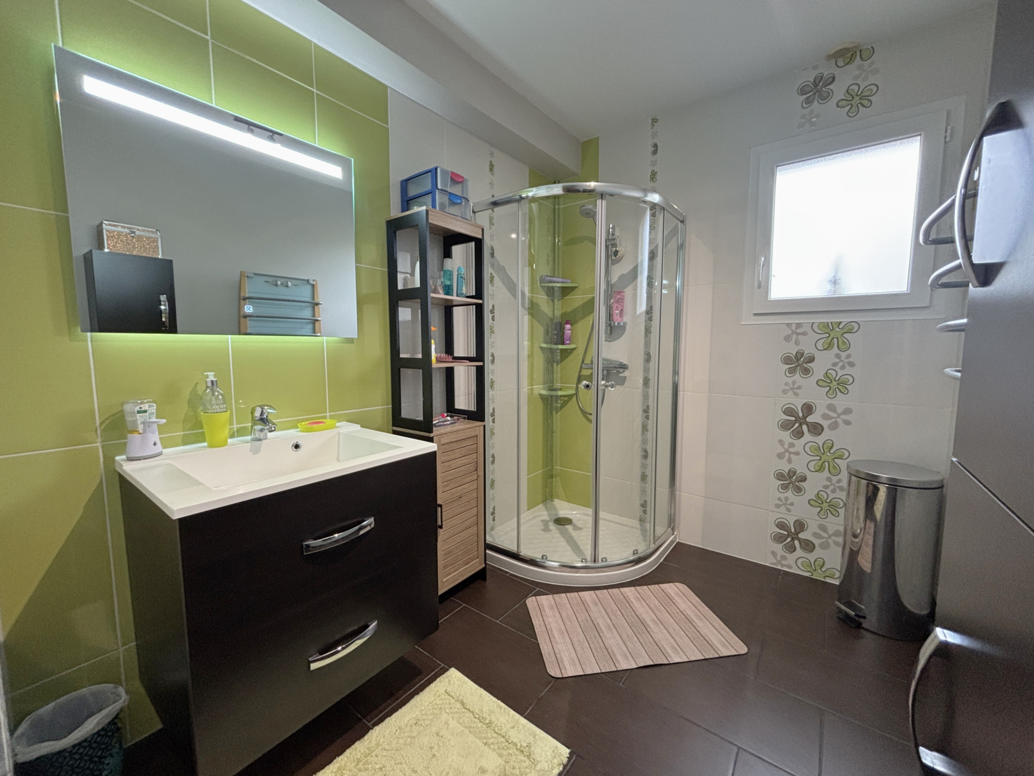 Dès l’entrée, des placards pratiques vous accueillent, avant de vous mener vers un séjour lumineux de +38m² avec une vue dégagée sur un jardin clos, sans vis-à-vis offrant un cadre agréable et intimiste.