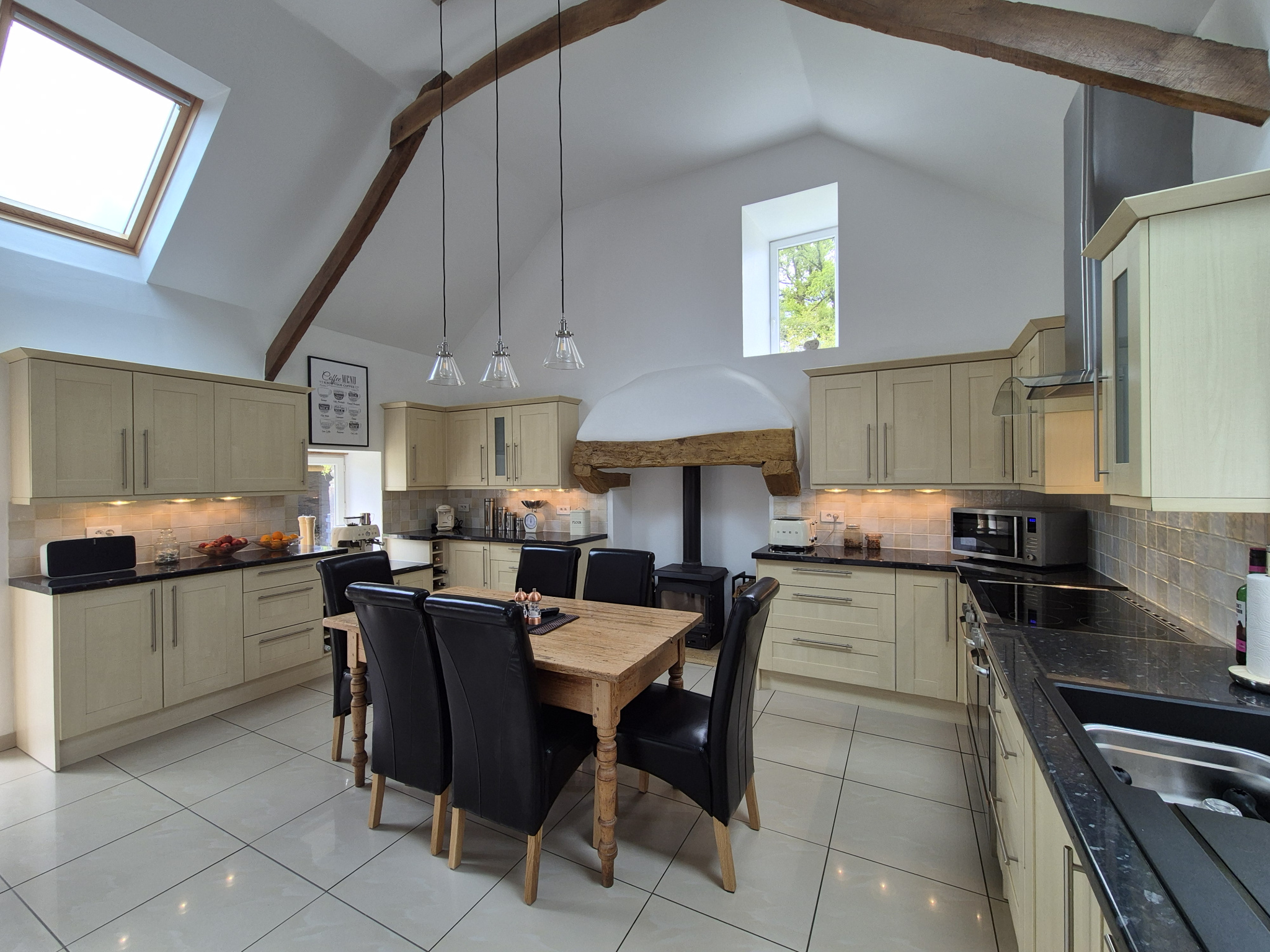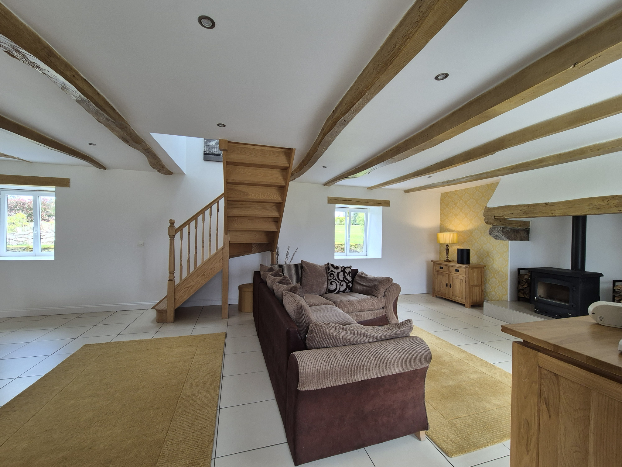 - Séjour lumineux de 47 m² avec poêle à bois.
