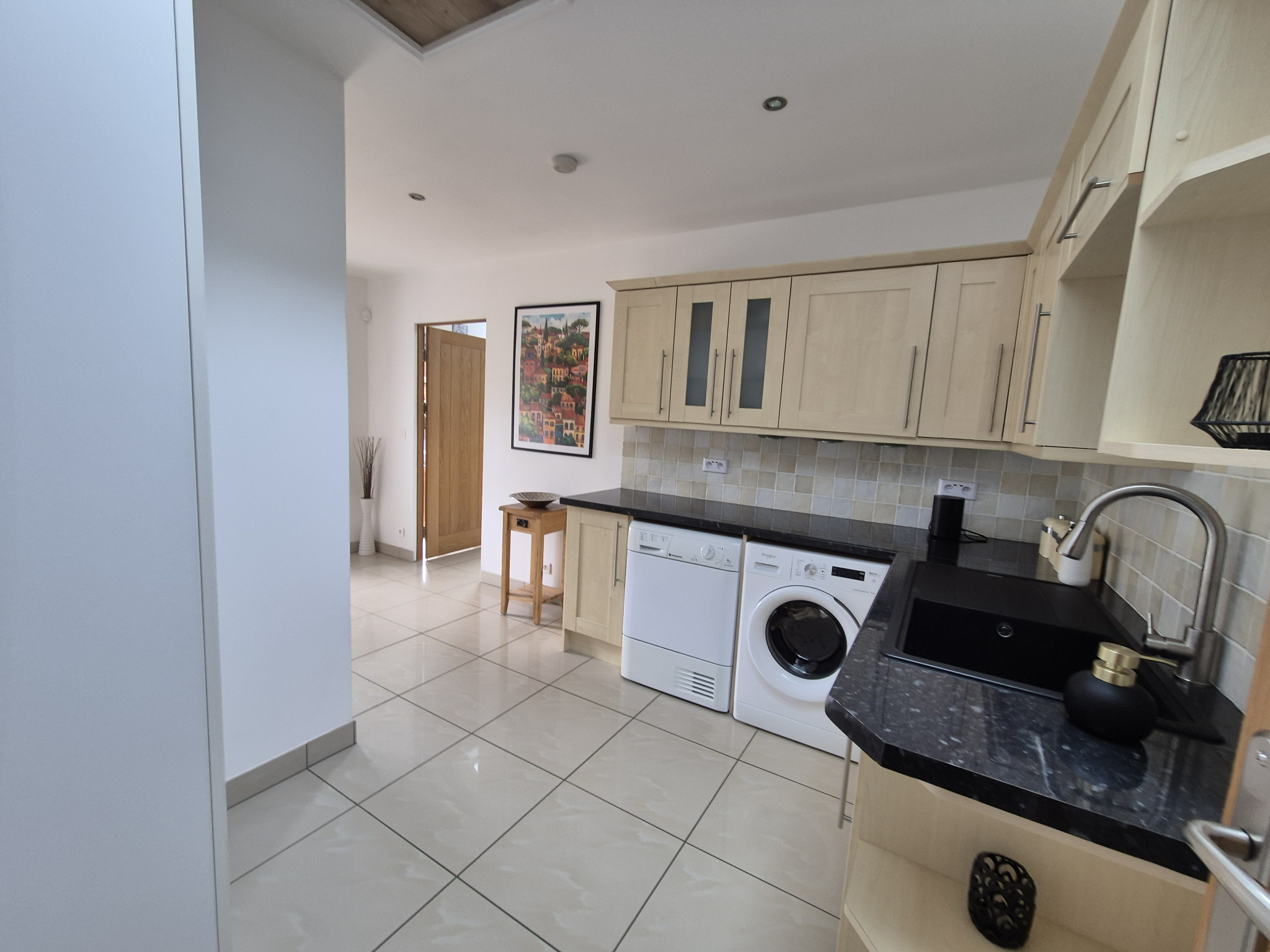 - Entrée, cuisine équipée avec poêle à bois, buanderie, salle d’eau-WC.