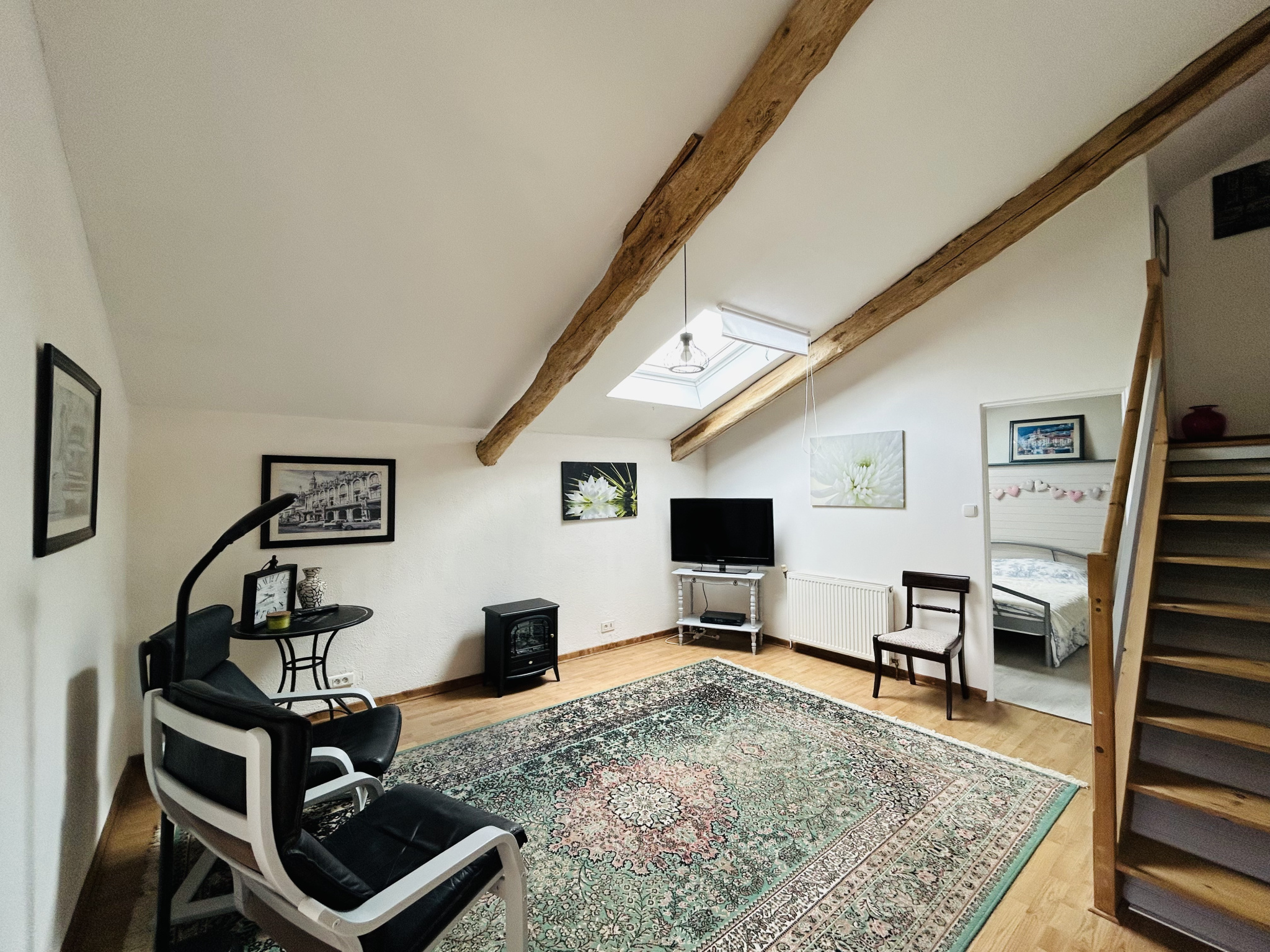 The property offers three comfortable and light-filled bedrooms, with character features such as exposed beams and roof windows. One of the bedrooms benefits from an adjoining second living space, providing flexible use as guest accommodation, extended family space, or even an artist’s studio.