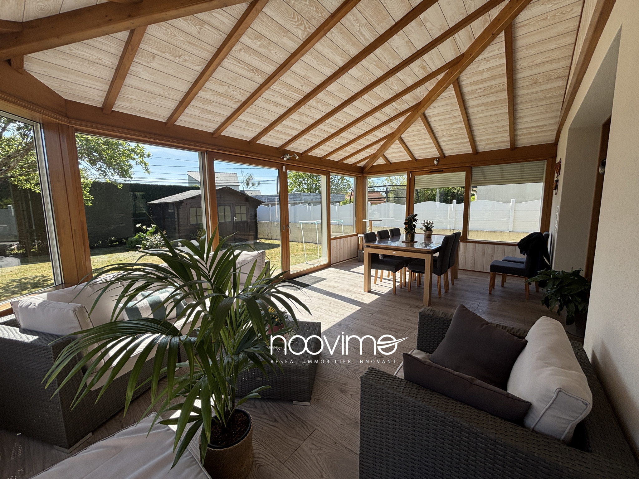 Une véranda prolonge l'espace de vie permettant de profiter du jardin .