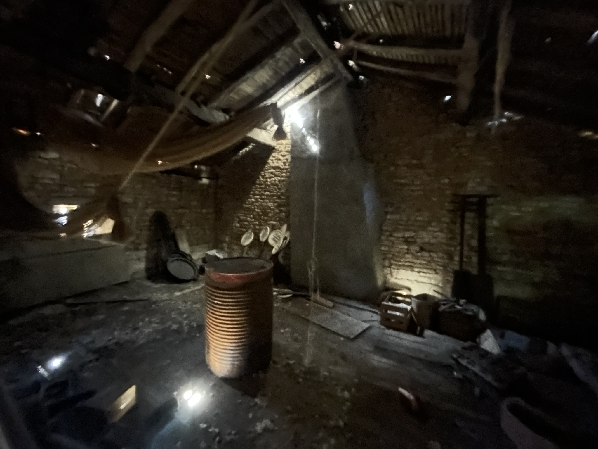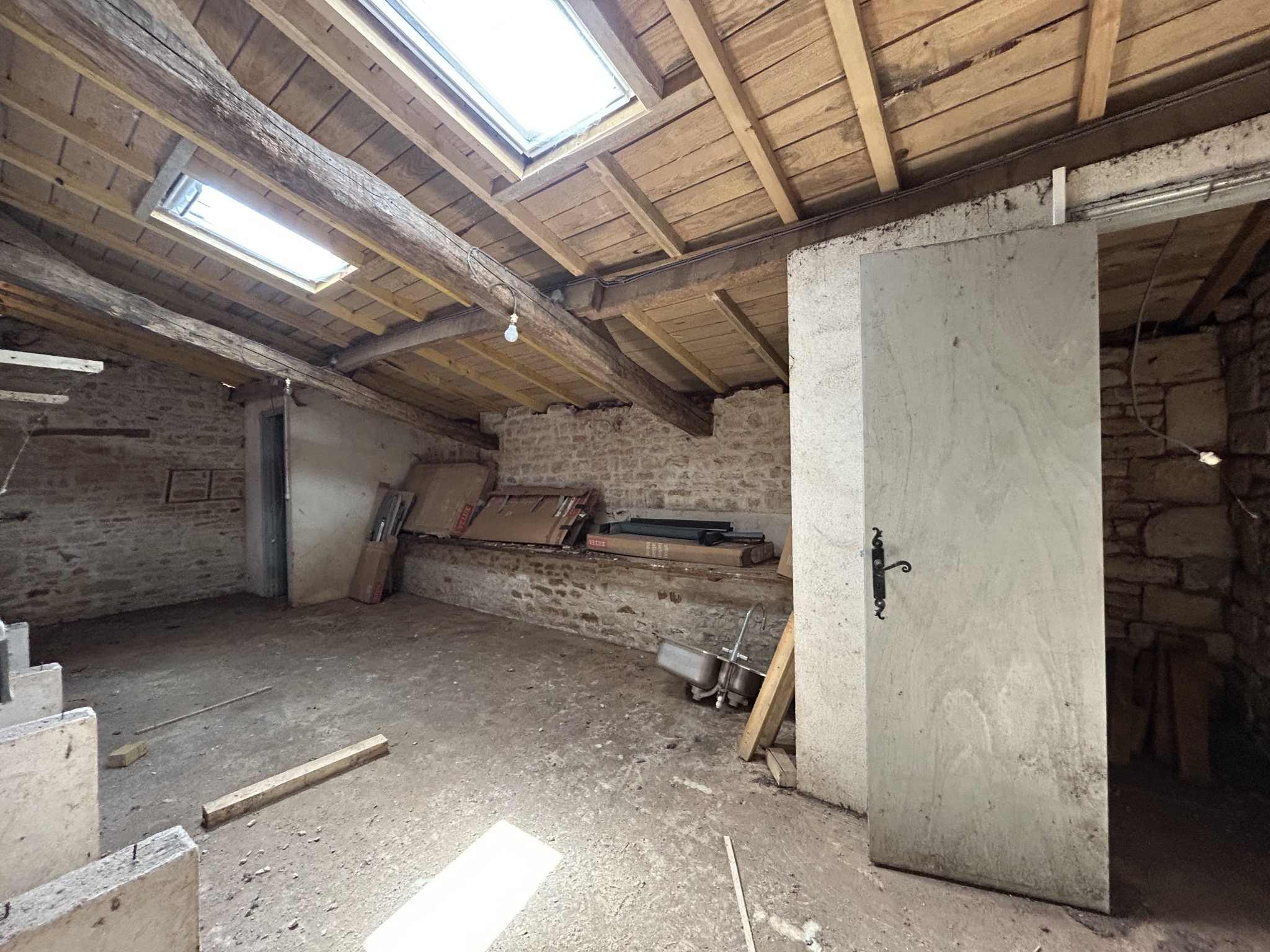 The property retains original features such as exposed beams and a fireplace but requires complete renovation.