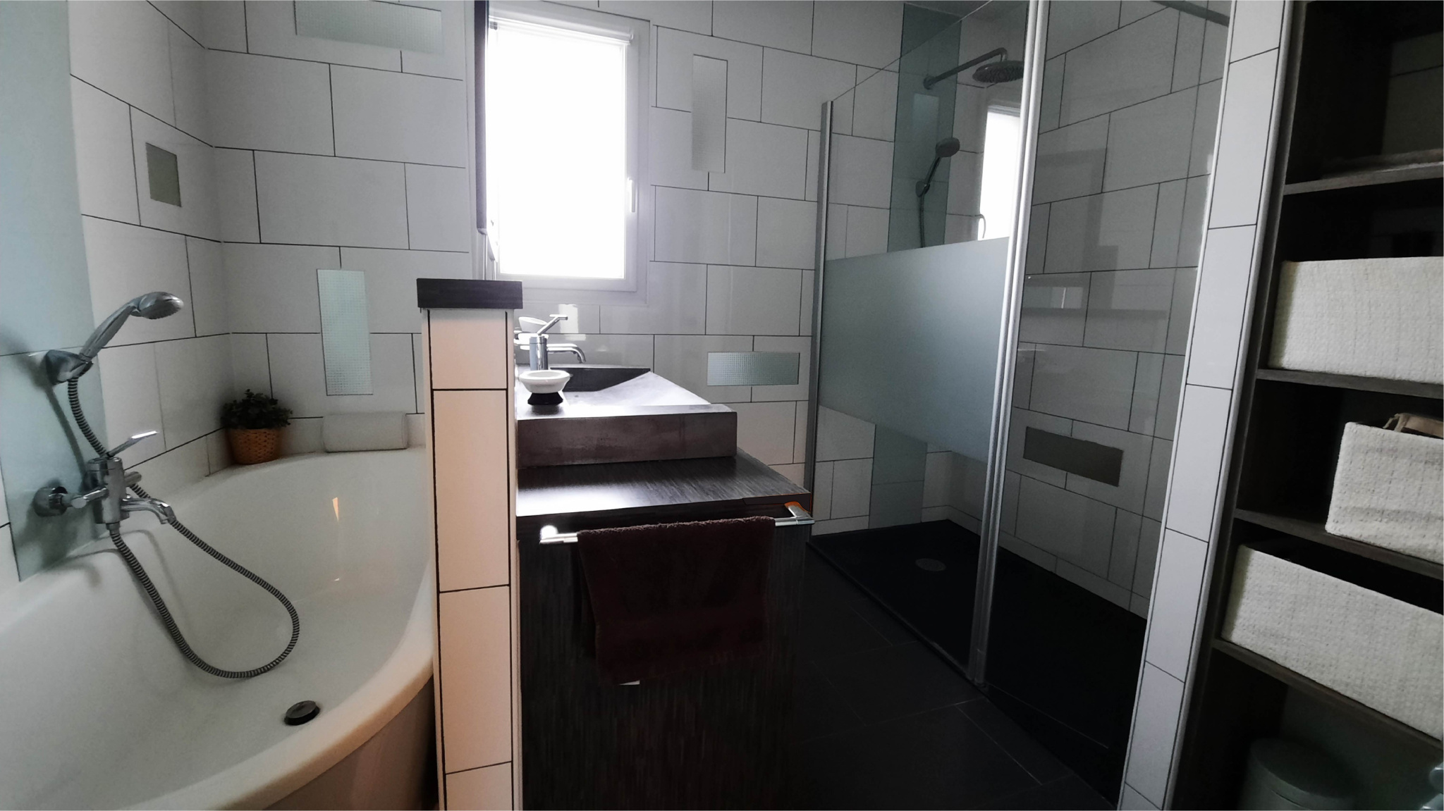 A l'étage, l'entrée de la passerelle dessert 2 chambres, puis salle de bains et WC. A l'extrémité de l'étage, une chambre parentale avec dressing et salle de bain/eau se poursuit par un balcon exposé au soleil couchant.